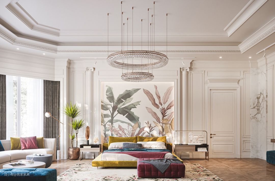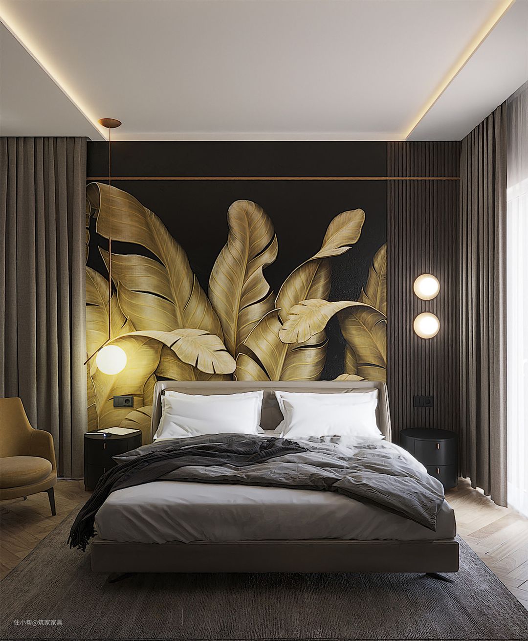在色彩缤纷的壁画上铺上金属卧室吊灯。增加的光泽将使焦点真正突出。