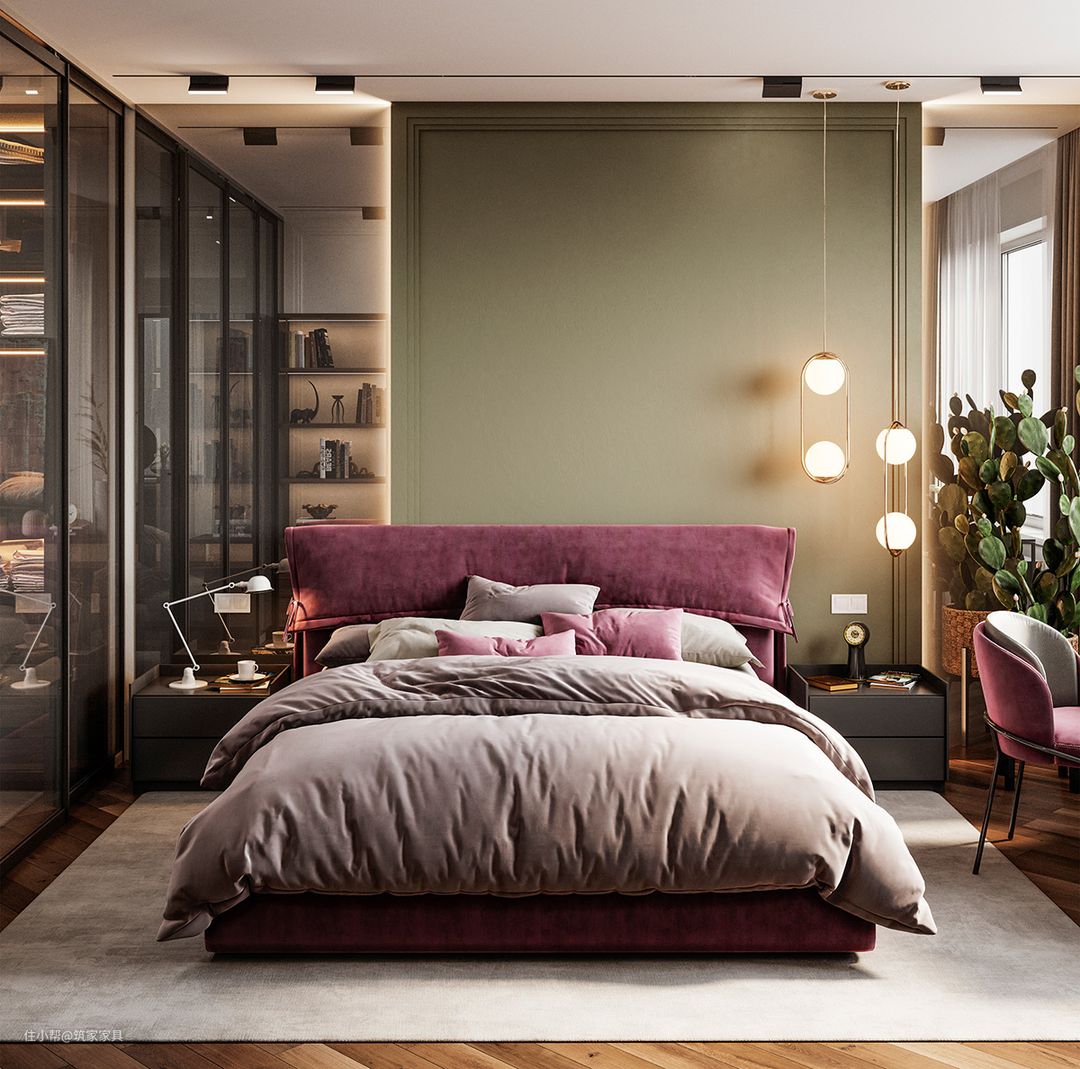 使用室内装饰来传达您的配色方案。使用从床到天花板堆叠的簇绒面板建造独特的双色床头板特色墙。选择毛绒、天鹅绒般的材质,营造奢华感。