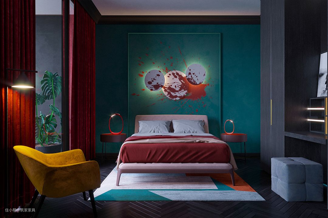 用一件明亮、引人注目的墙壁艺术来抵消深青色的卧室设计。