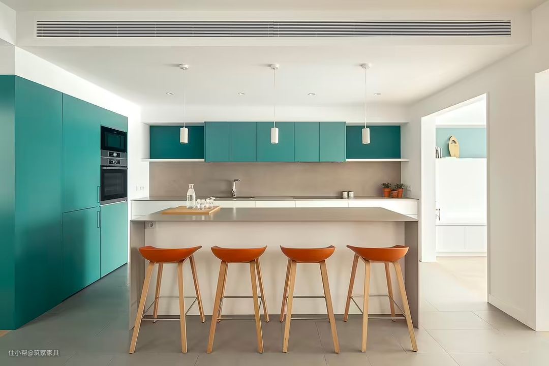 棕色的厨房吧台凳为这个绿松石色的厨房增添了一种驯服的因素。较低的橱柜和厨房岛通过干净的白平衡来平息色彩爆炸。