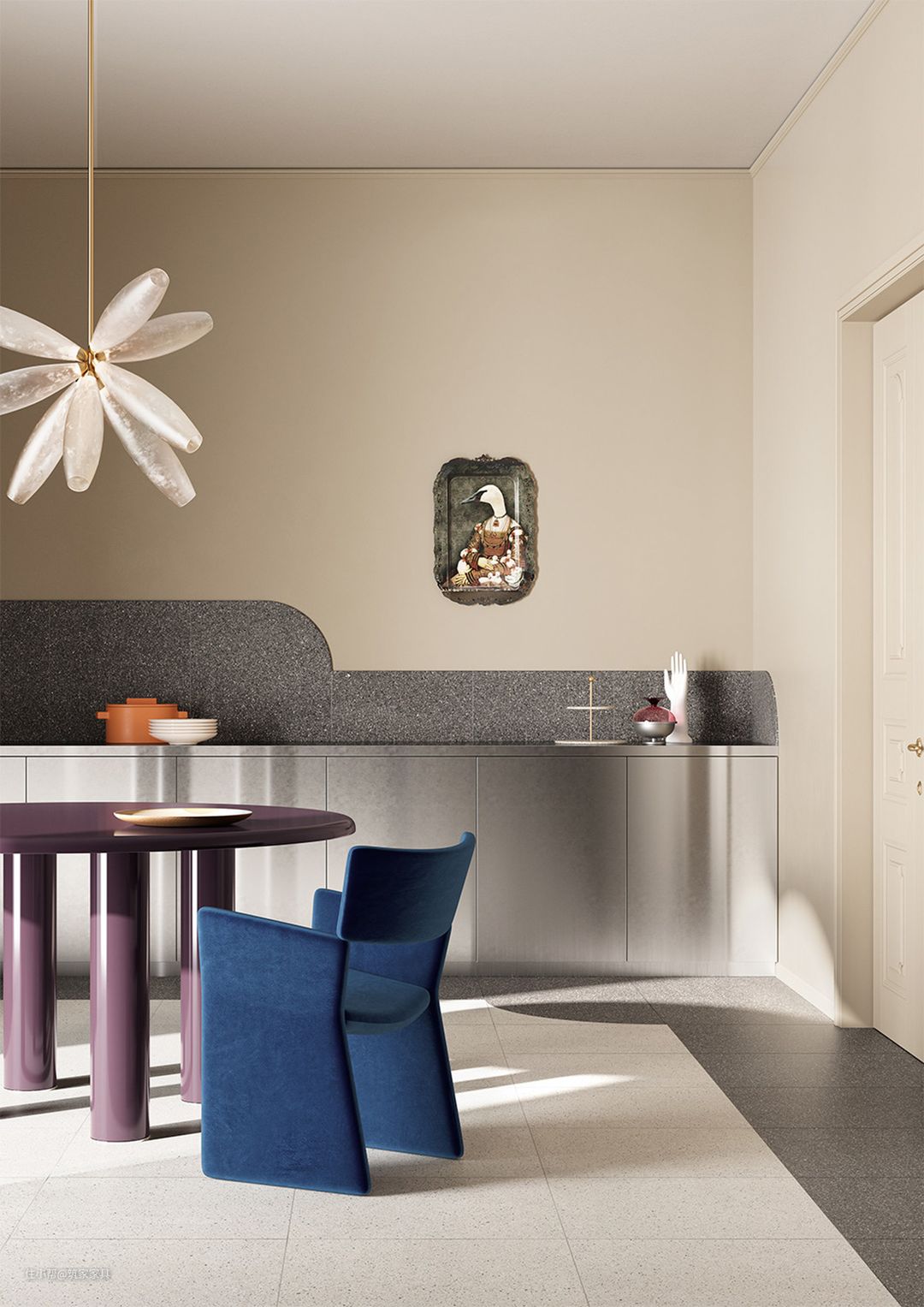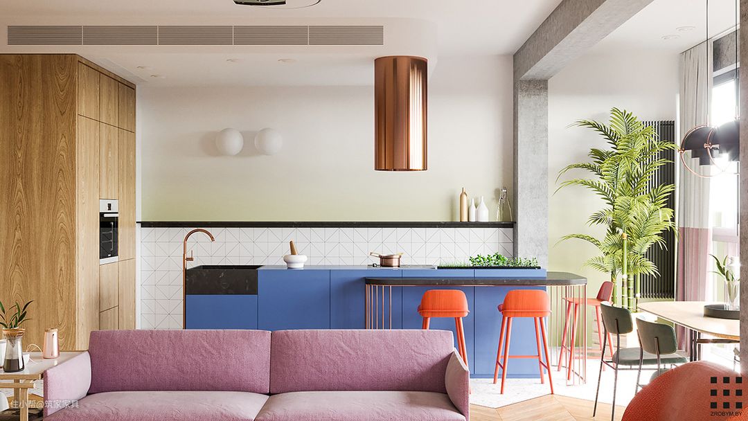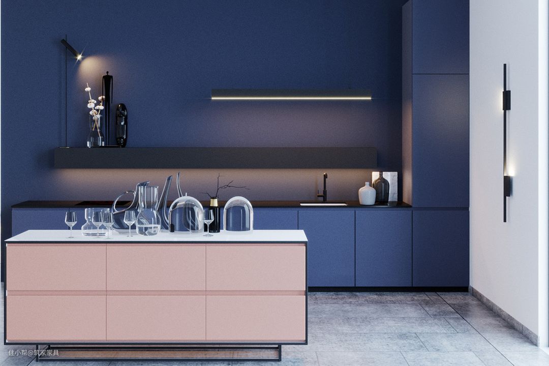 柔和的蓝色色调为多种强调色营造出清新的背景。以这个小厨房概念为例。浅蓝色的厨柜和配套的墙漆成为阳光黄色和亮粉色元素的平滑支撑。