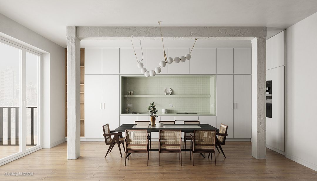 薄荷绿色的上部橱柜和浅色木质下部橱柜营造出平静而令人振奋的厨房调色板。这种厨房设计保持了颜色分区,顶部有配套的薄荷绿吊灯,下面有浅色木质餐桌。