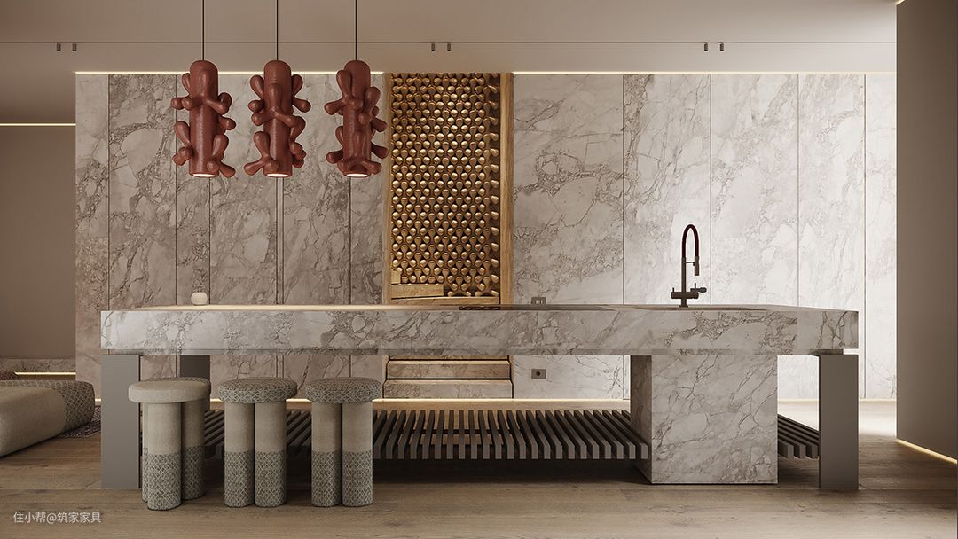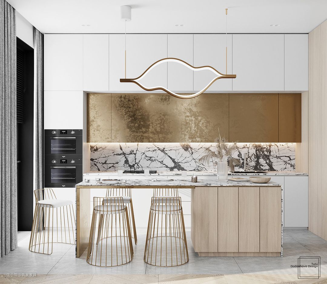 当用金色切割时,白色大理石厨房看起来光彩夺目,尤其是当 3D 纹理增添额外的光泽和尺寸时。在这个设置中,独特的棕色吊灯将美妙的温暖融入到凉爽的石材方案中。