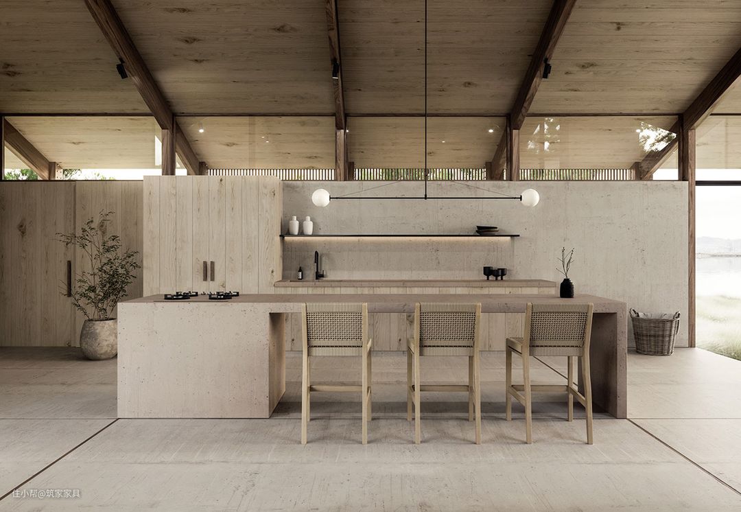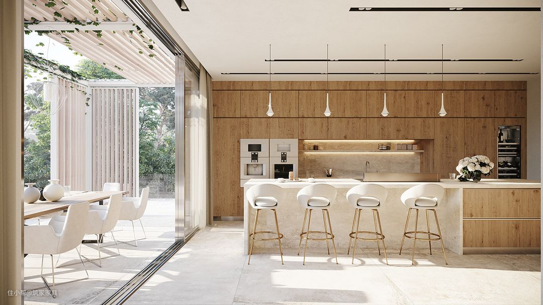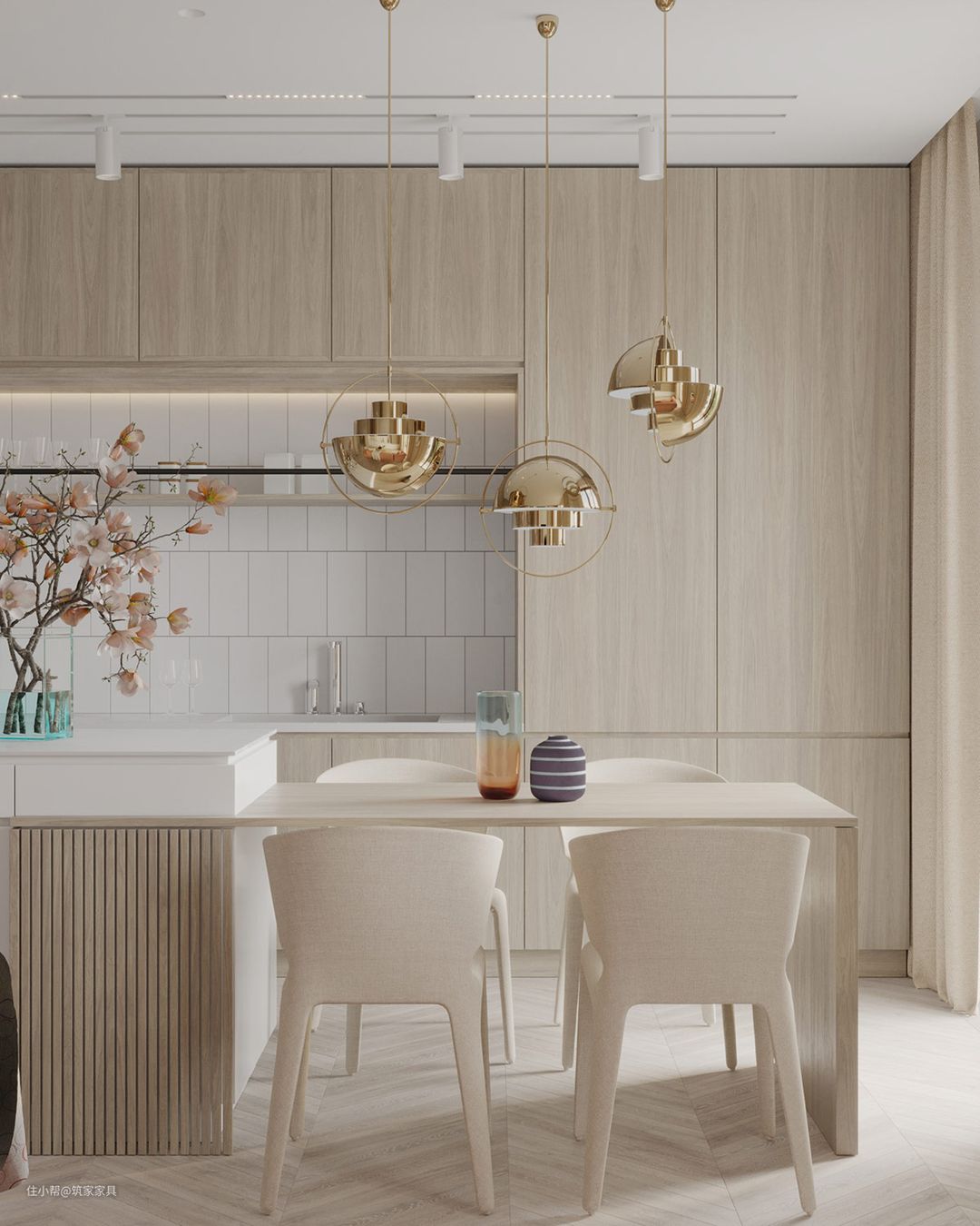 在全木色调的厨房中,金色厨房吊灯增添了丰富的品味。用一些色彩鲜艳、有图案的小件来摆脱安静的中性背景,比如这些引人注目的装饰花瓶。