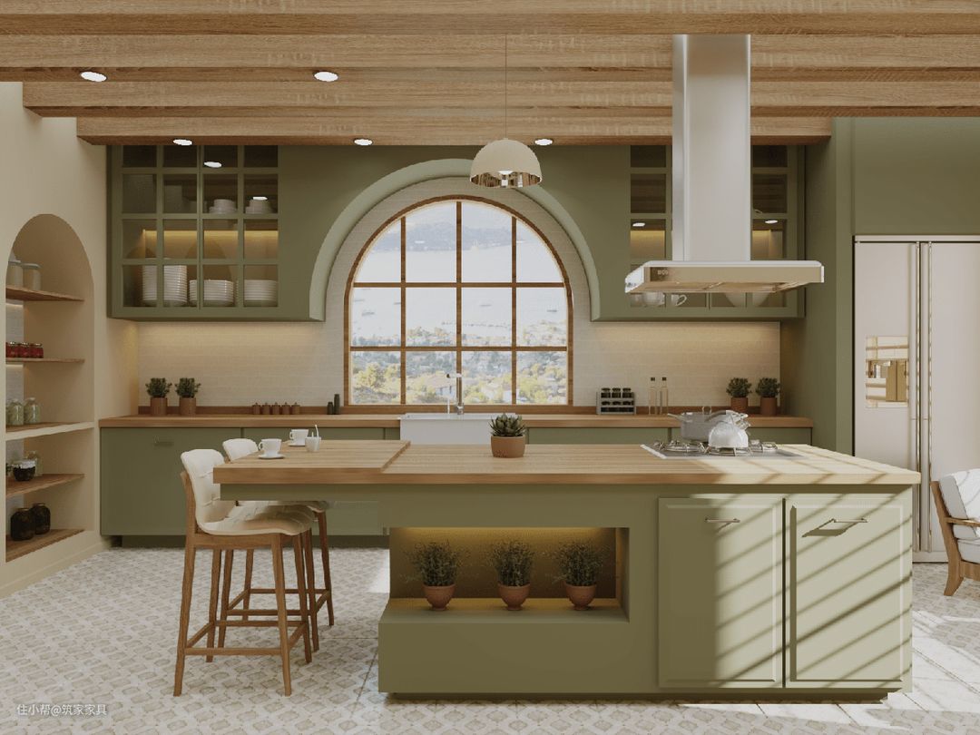 鼠尾草绿营造出与自然的柔和联系。使用这种平静的色调让纯白色的厨房充满活力,然后添加天然木材元素为方案增添深度。