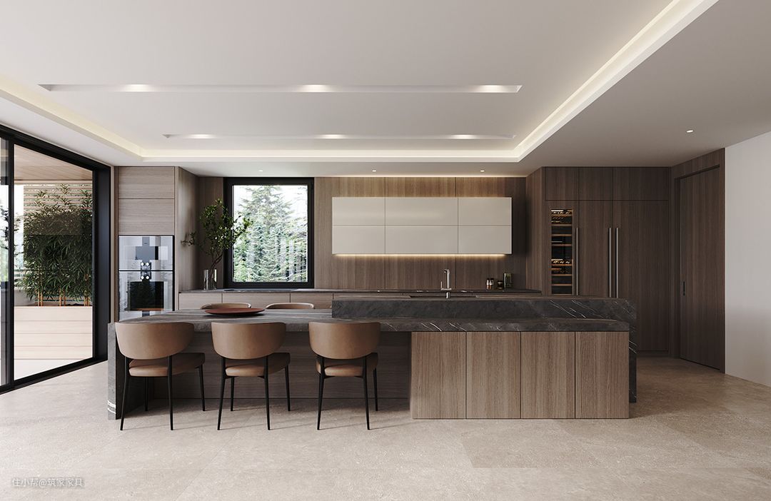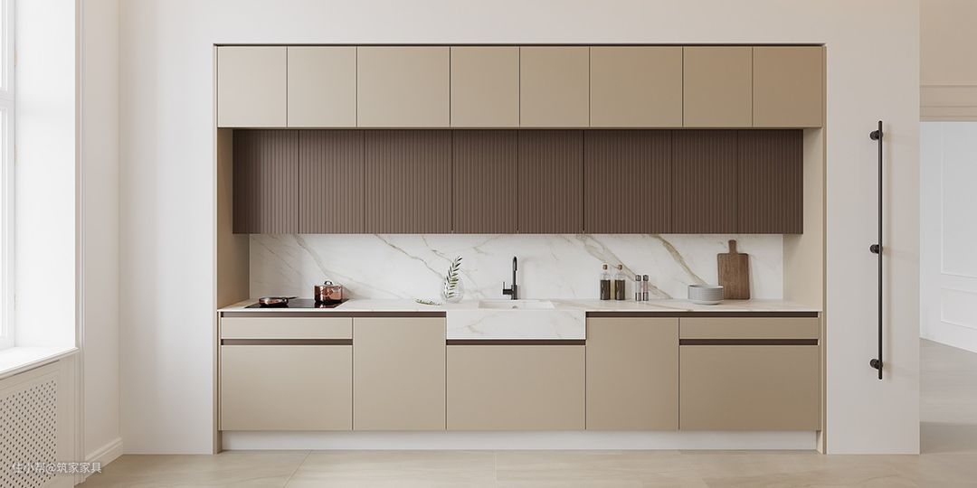 巧克力棕色色调为厨房带来即时温暖。与浅色木质台面和相配的地板相结合,使外观更加明亮。