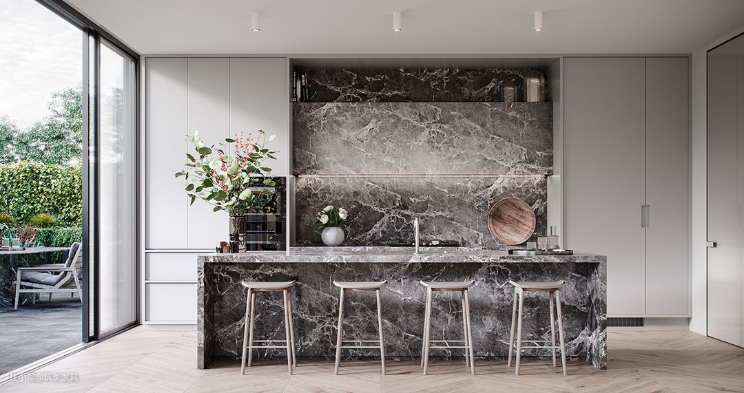 在白色厨房设计的中心切割出一条引人注目的深灰色大理石。