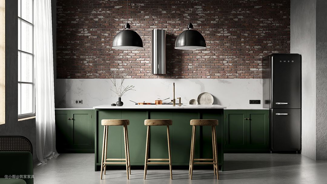 露的红色砖墙特色墙相结合,形成丰富的色彩对比。这种厨房设计在两者之间放置了白色大理石后挡板,以清新并提升外观。