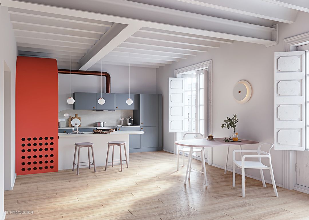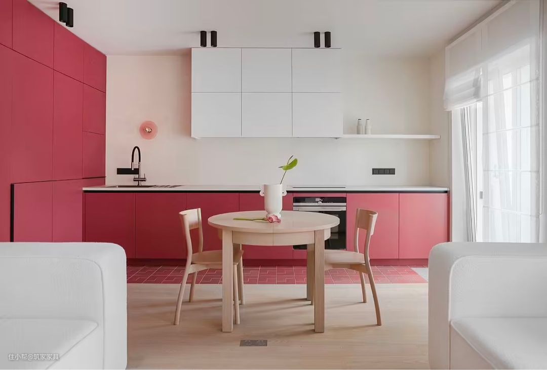 亮泽的红色厨房为完美的粉白色基底画上点睛之笔,就像一层光滑迷人的红色唇彩。