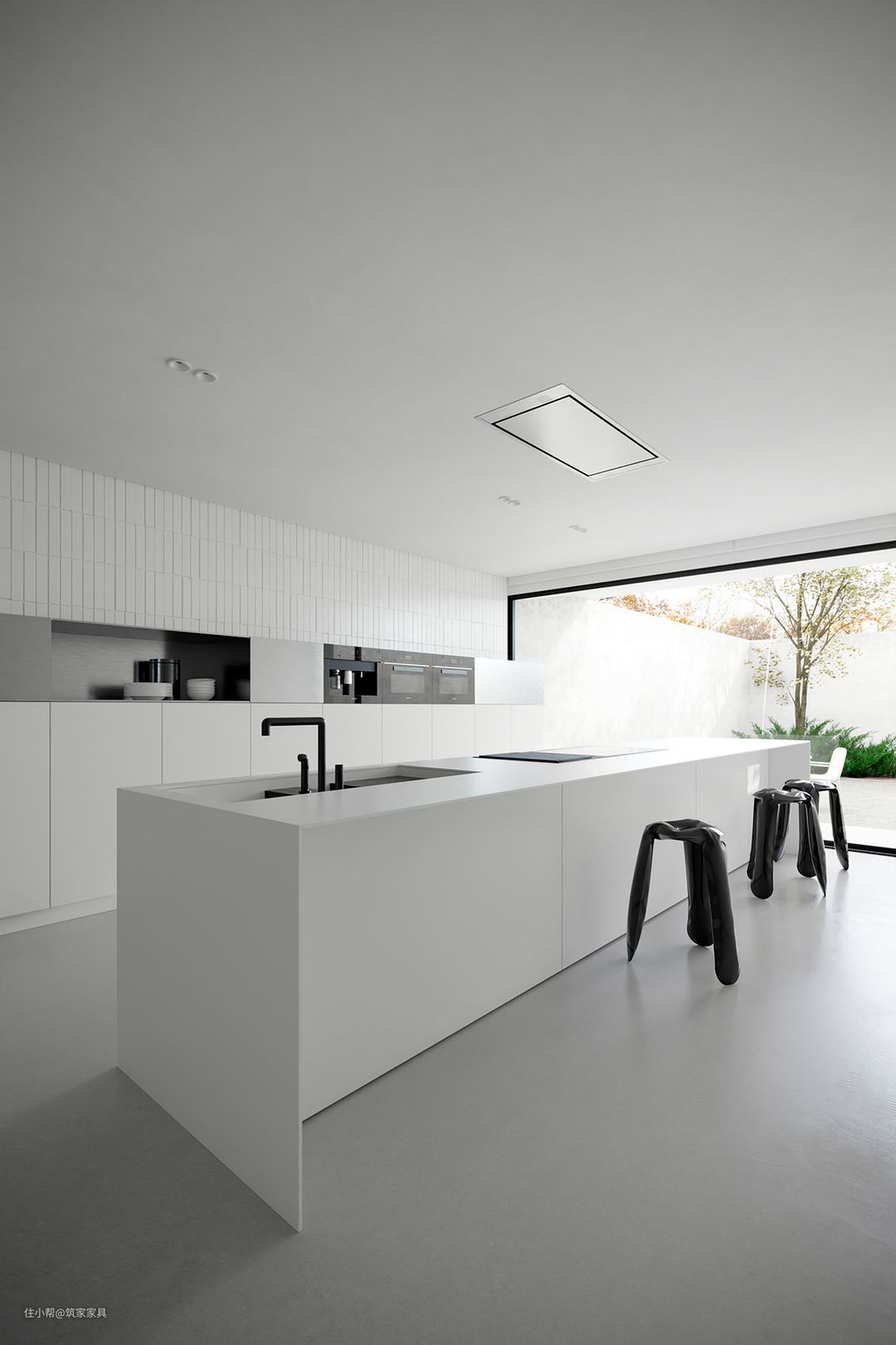 用强烈的黑色轮廓让白色厨房变得更加锐利。