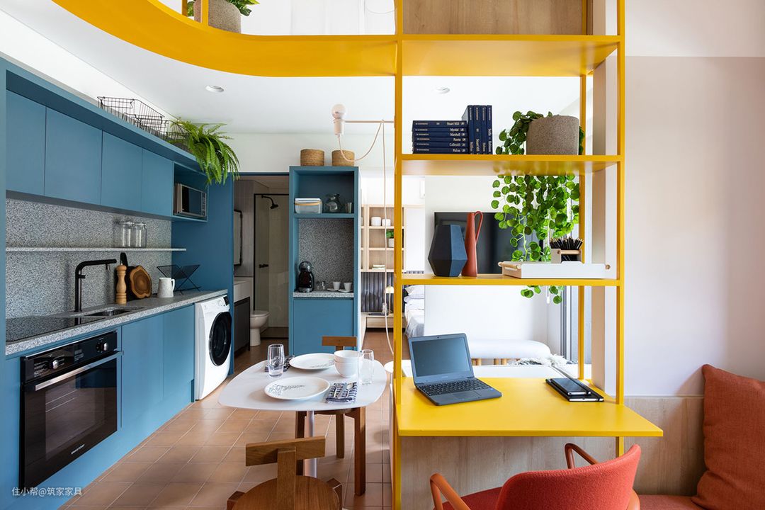 用一条白色分隔亮蓝色和黄色元素。加入一些红色单品,打造出蒙德里安风格的空间。