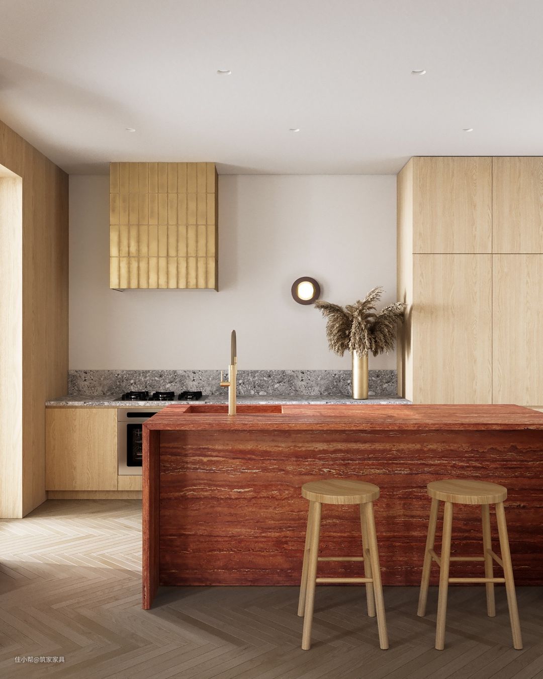 如果您正在考虑拥有不同颜色岛台的厨房,那么请看看这个令人惊叹的设计。带有瀑布台面的独特红石厨房岛是这场秀的明星,而木质橱柜和灰色台面则扮演配角。引人注目的金色抽油烟机平衡了大胆的焦点。