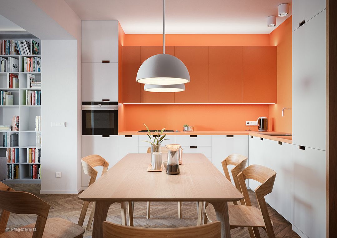 深珊瑚色是厨房的超级时尚选择,并且具有很强的冲击力。不要用这种个性化的色调覆盖所有单元,而是考虑坚持使用墙漆、瓷砖后挡板或仅几个壁柜。