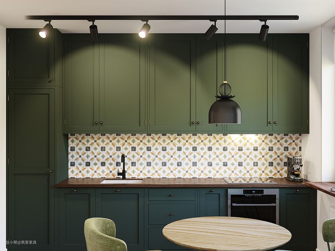 深绿色的厨房有一种旧世界的魅力。采用锋利的黑色灯具使美学现代化。