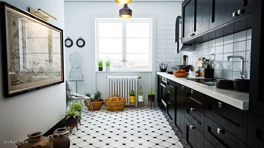 当与干净的框架橱柜和经典地砖搭配时,黑白厨房配色方案具有永恒的吸引力。