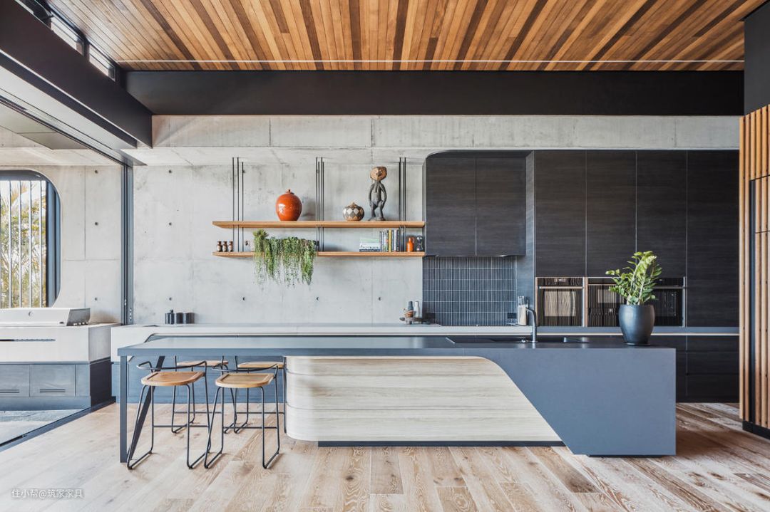 利用木质台面和立柱的自然温暖感来改造酷炫的不锈钢、黑色和白色厨房组合。