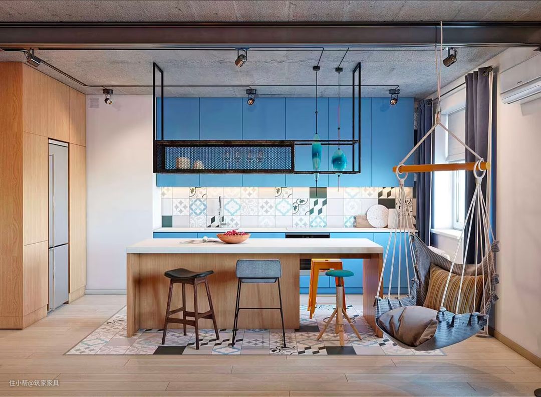 大胆的蓝色单元和繁忙的蓝色水磨石一定会让您保持高能量水平,即使是在为家人准备晚饭时也是如此。