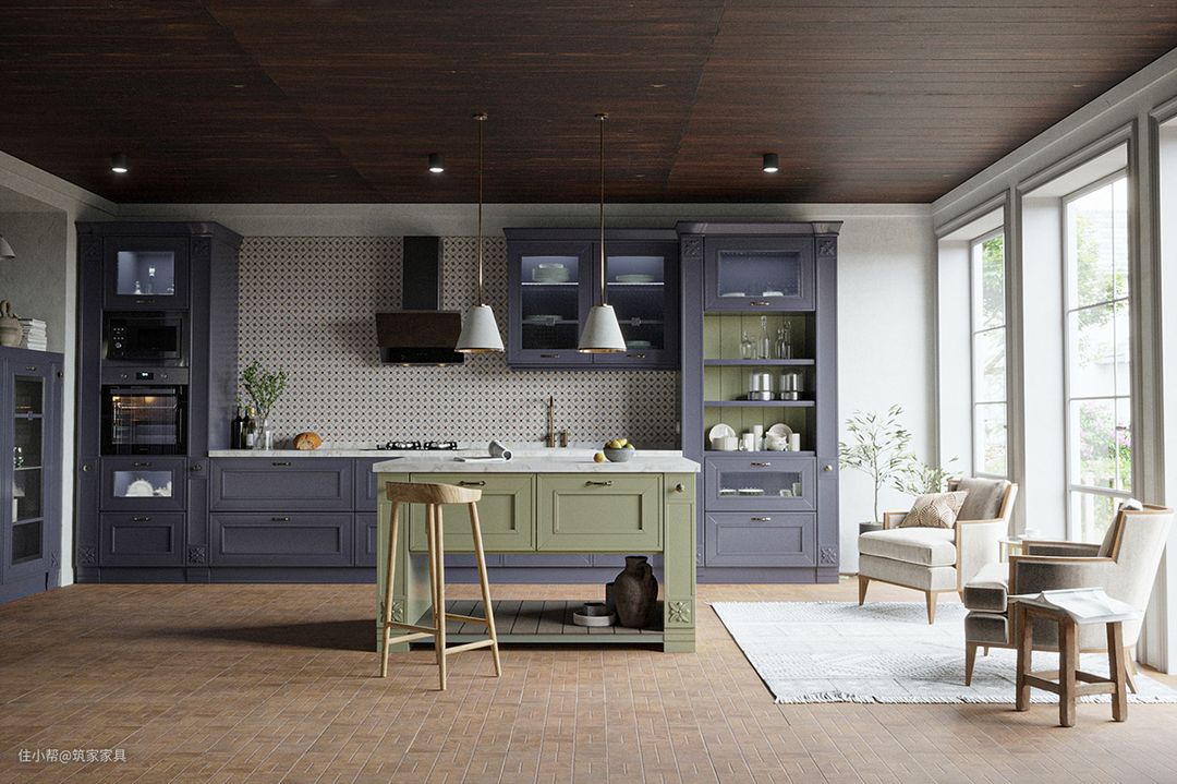 柔和的蓝色厨房岛台为中性米色、木质或白色的厨房设计增添了一丝冷色条纹。使用一排匹配的蓝色底座单元和颜色协调的后挡板来强化效果。