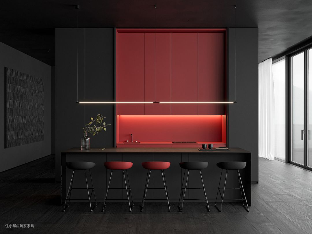 用深黑色的背景重新打造鲜红色的厨柜和配件。哑光黑色饰面会吸收光线,让更有活力的作品闪闪发光。