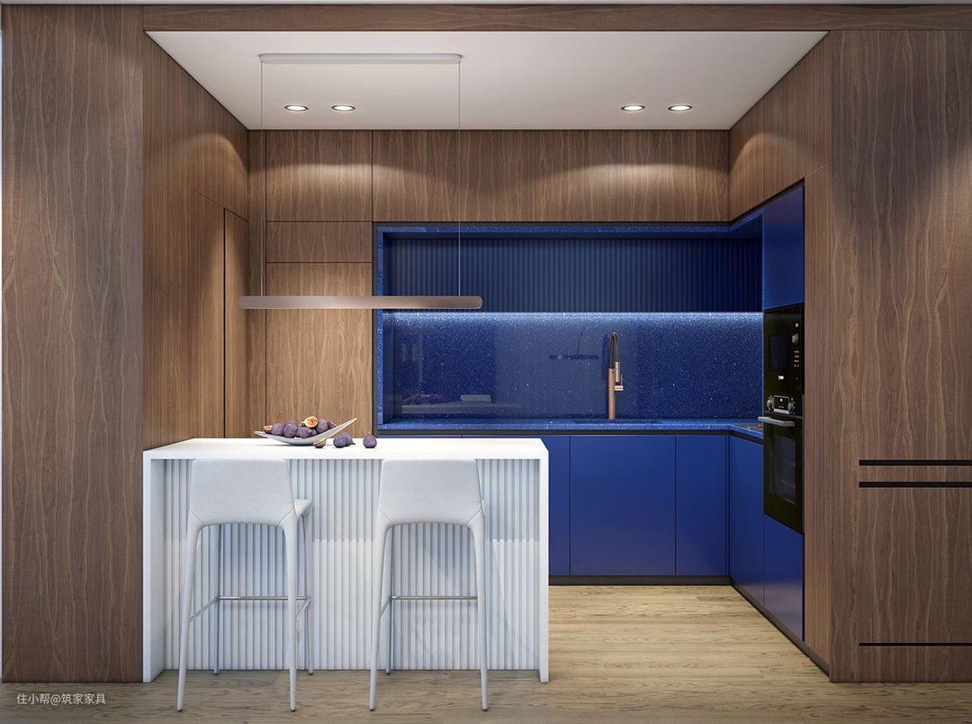 深胡桃木橱柜环绕让钴蓝色的厨房装饰变得流行。第三个对比立方体被放置在这个厨房概念中,增加了清爽的白色厨房半岛和配套的白色软垫吧凳。
