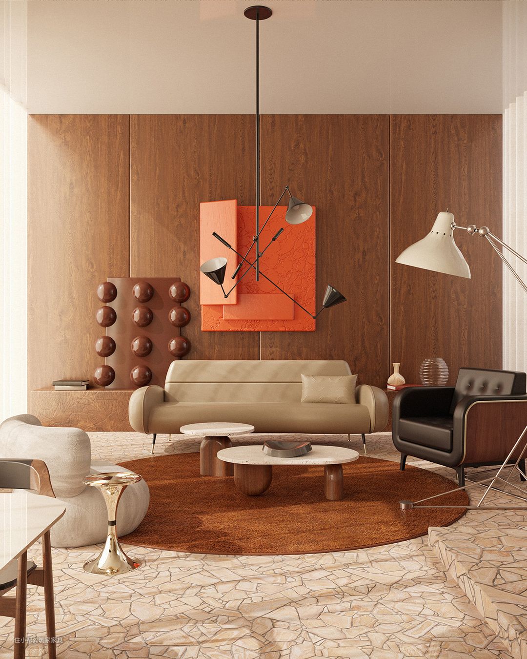 用棕色色调营造视觉温暖感。利用天然木材元素(例如木质特色墙或天花板)扩展这种舒适的颜色选择。