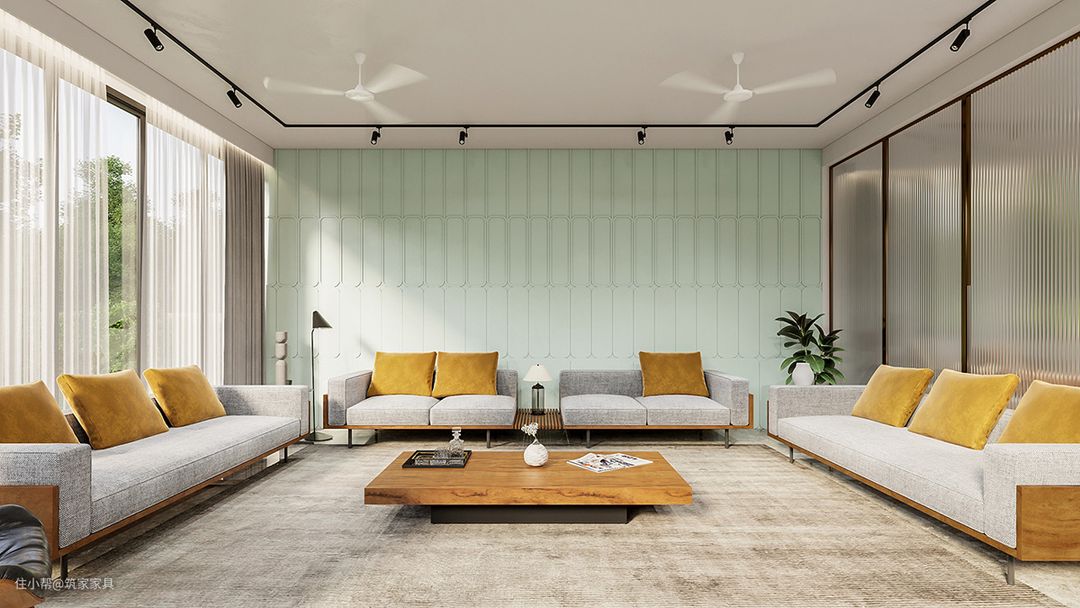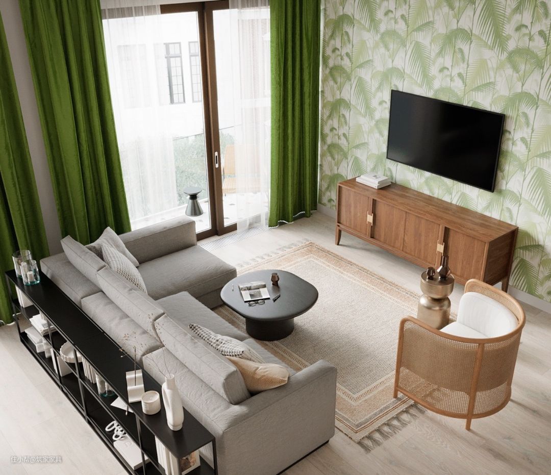 绿色客厅非常适合植物主题,例如树叶印花壁纸、花卉靠垫或植物艺术品。
