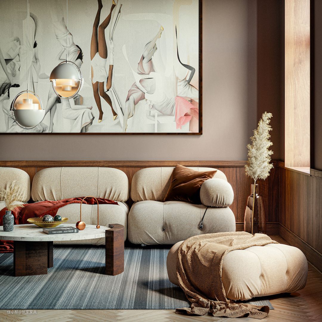 使用天然材料来组装棕色装饰口音。想想木质咖啡桌和特色椅子、天然地毯和棕色皮革沙发。