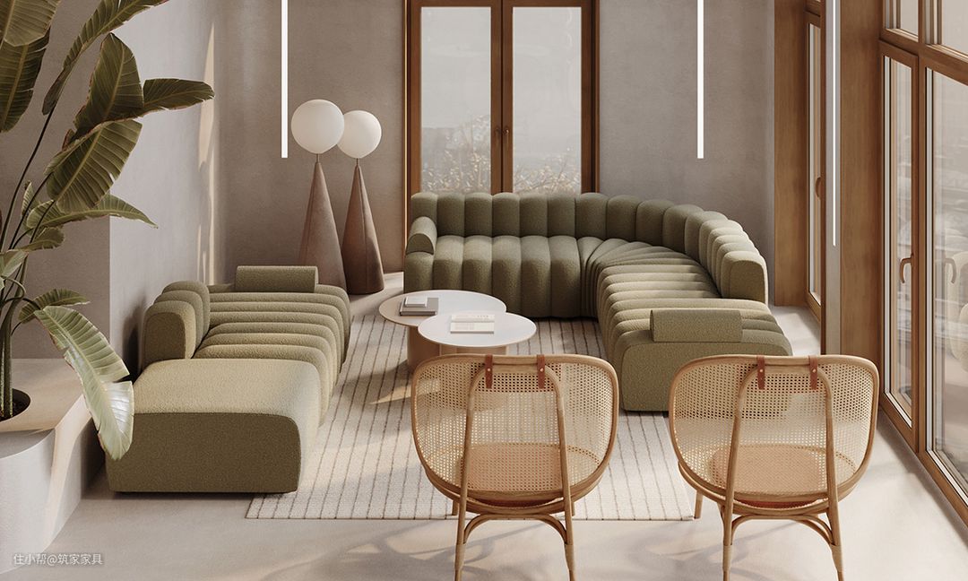 绿色的软垫家具和天然的藤椅让灰色的环境变得生机勃勃。朴实的色彩组合会让您感觉平衡和充满活力。