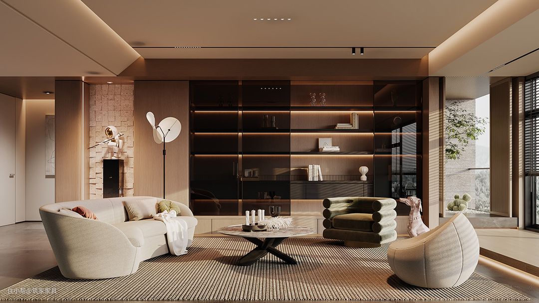 通过深色、烟熏玻璃元素和大气气氛照明,为朴实的调色板增添时尚感。