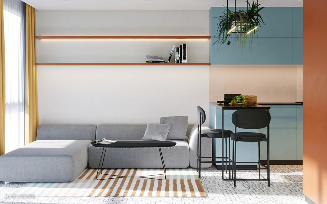 将柔和的橙色客厅色调与浅蓝色搭配,营造出清新且振奋人心的环境。