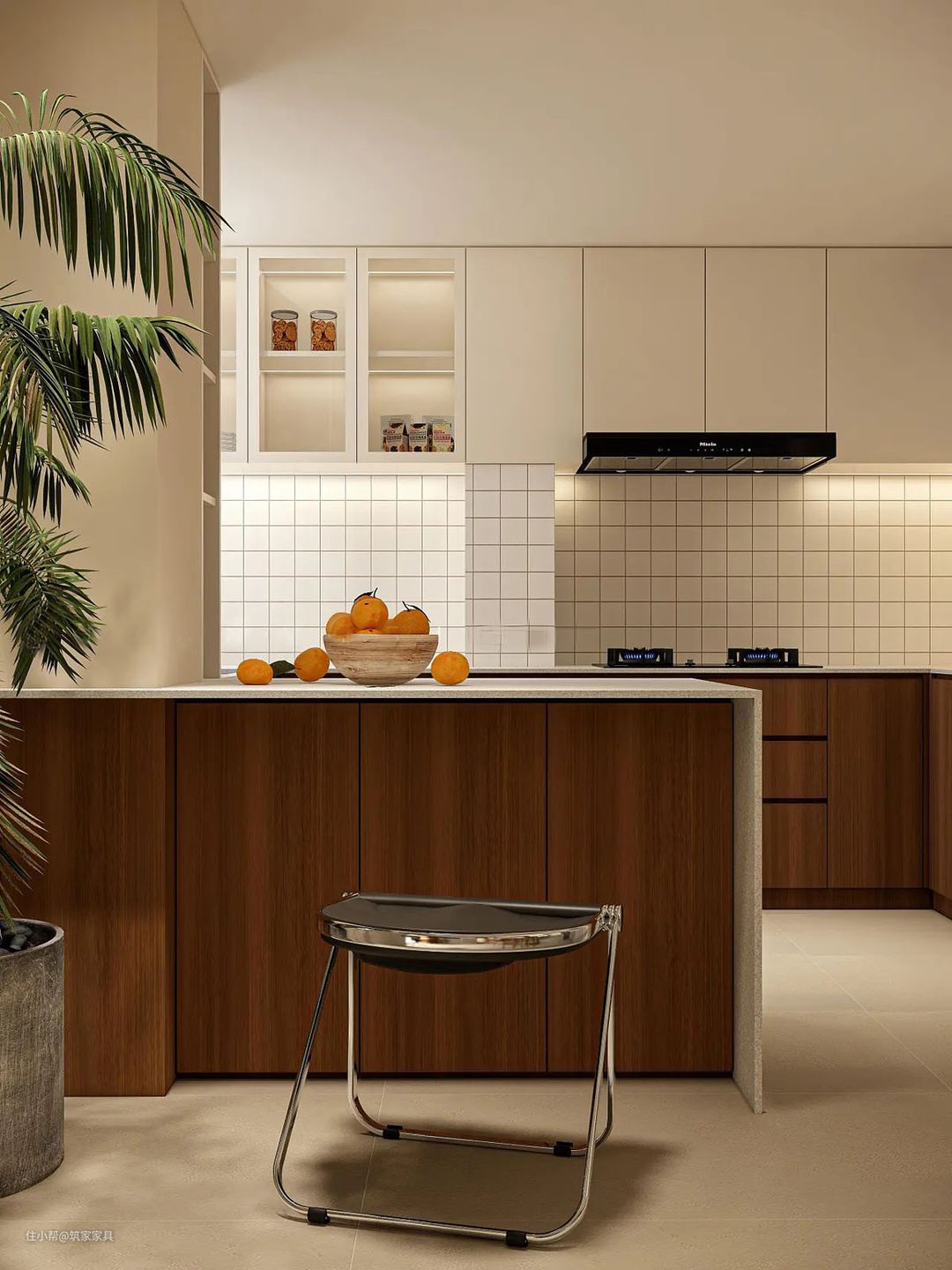 厨房半岛旁,一棵巨大的棕榈树生长着一阵活泼的自然色彩。