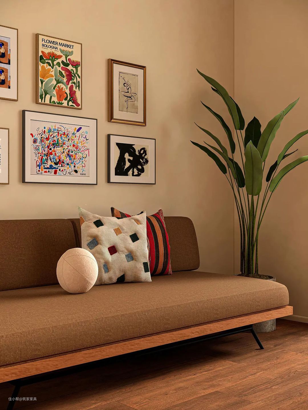 沙发后面的墙壁上有一面画廊墙,色彩斑斓。