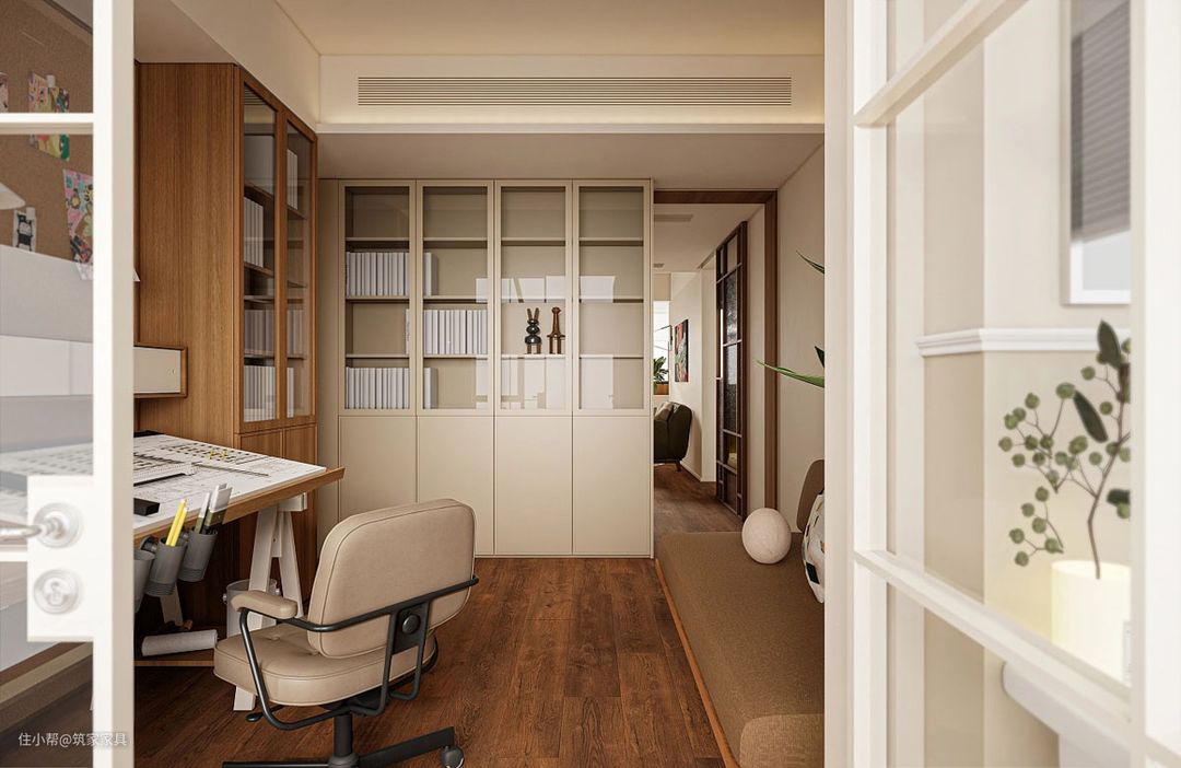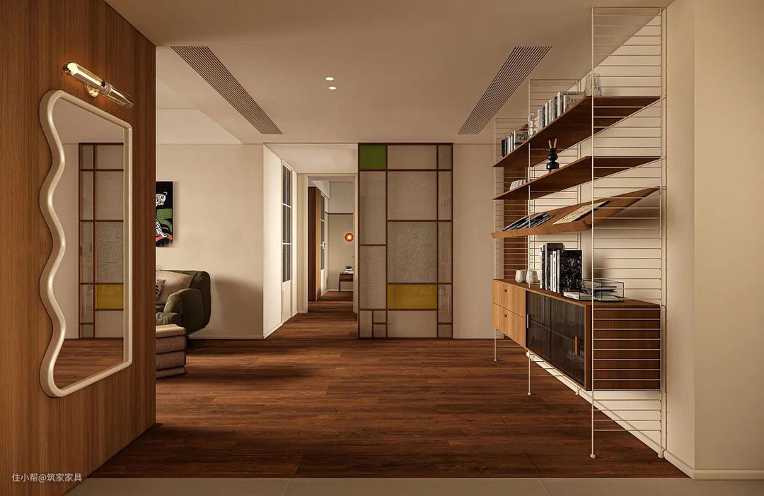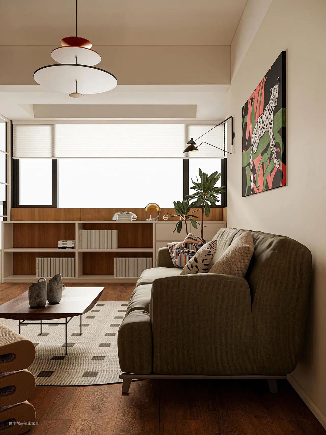 客厅环绕成一个阅读休息室,地板从米色的砂浆变成了温暖的木板。
