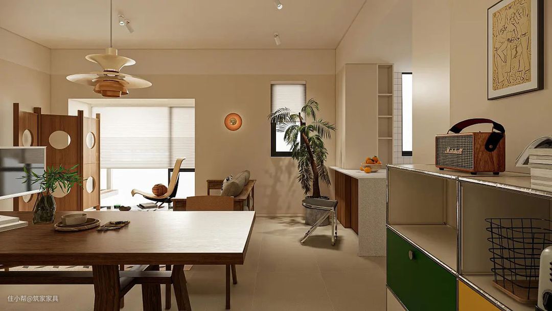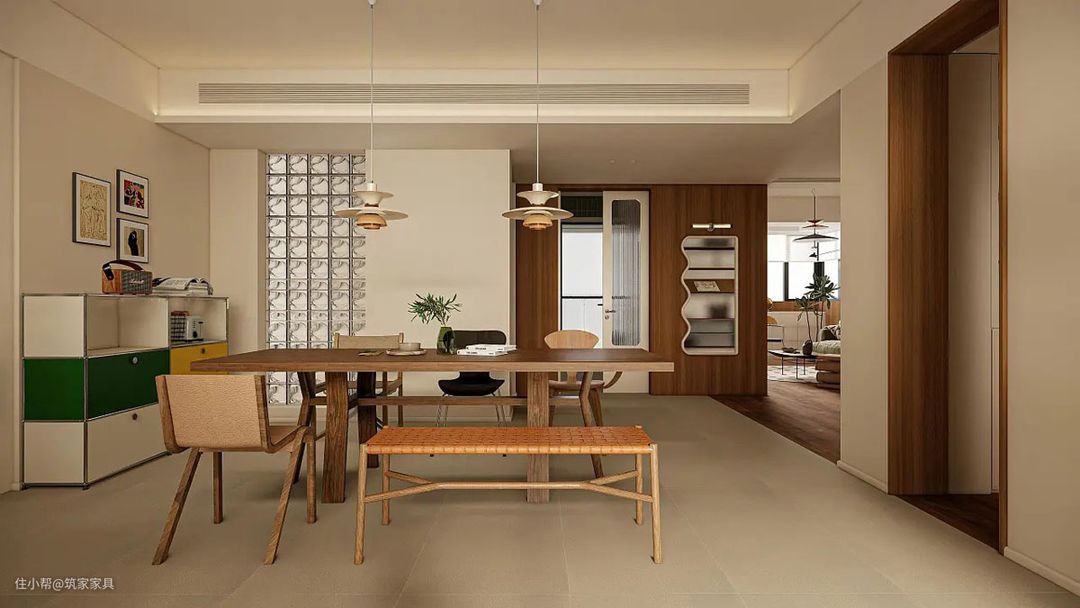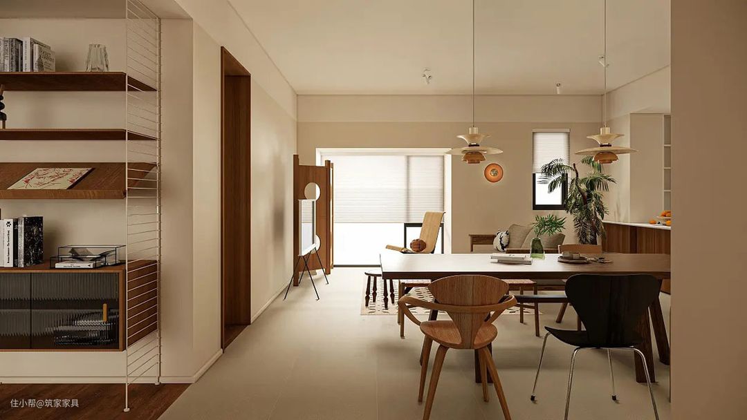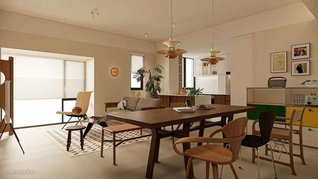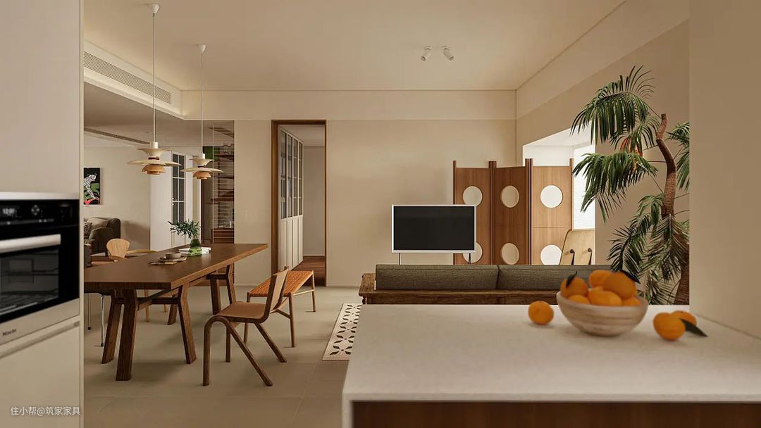 正式的用餐区布置在休息区的一侧,而厨房则位于起居空间的后面。