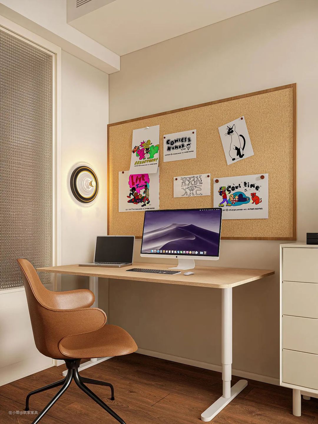 木桌子上方安装了一块软木记事板,与棕褐色皮革桌椅相得益彰。圆形壁灯营造出明亮的光芒。