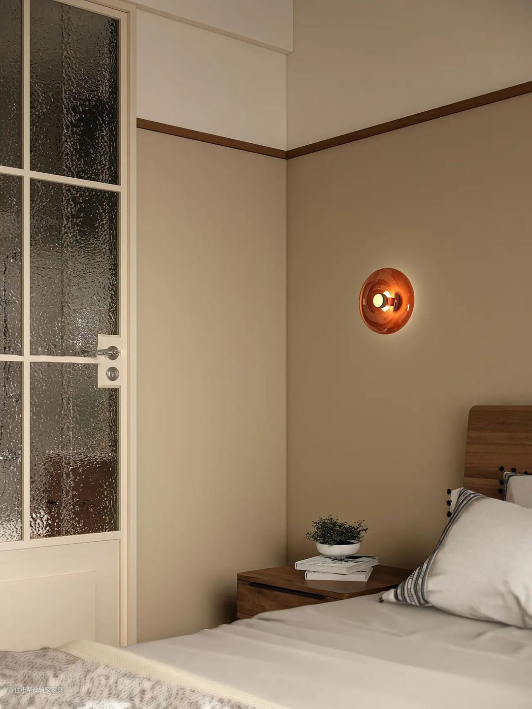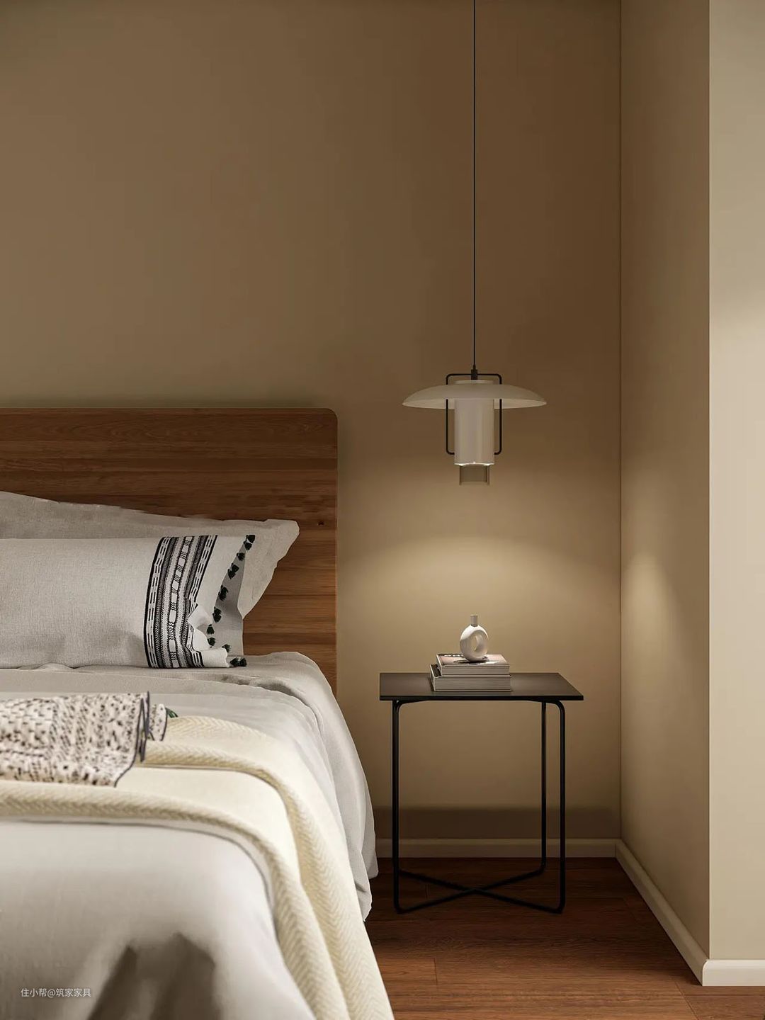 另一张床头柜则由中世纪风格的吊灯照亮。查看更多时尚卧室吊灯创意。