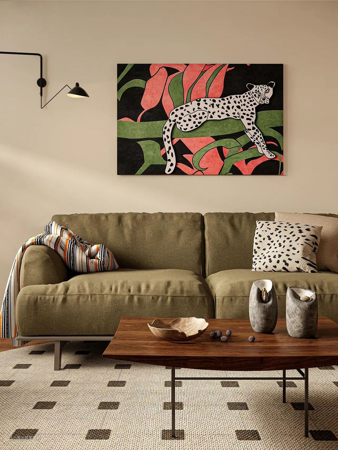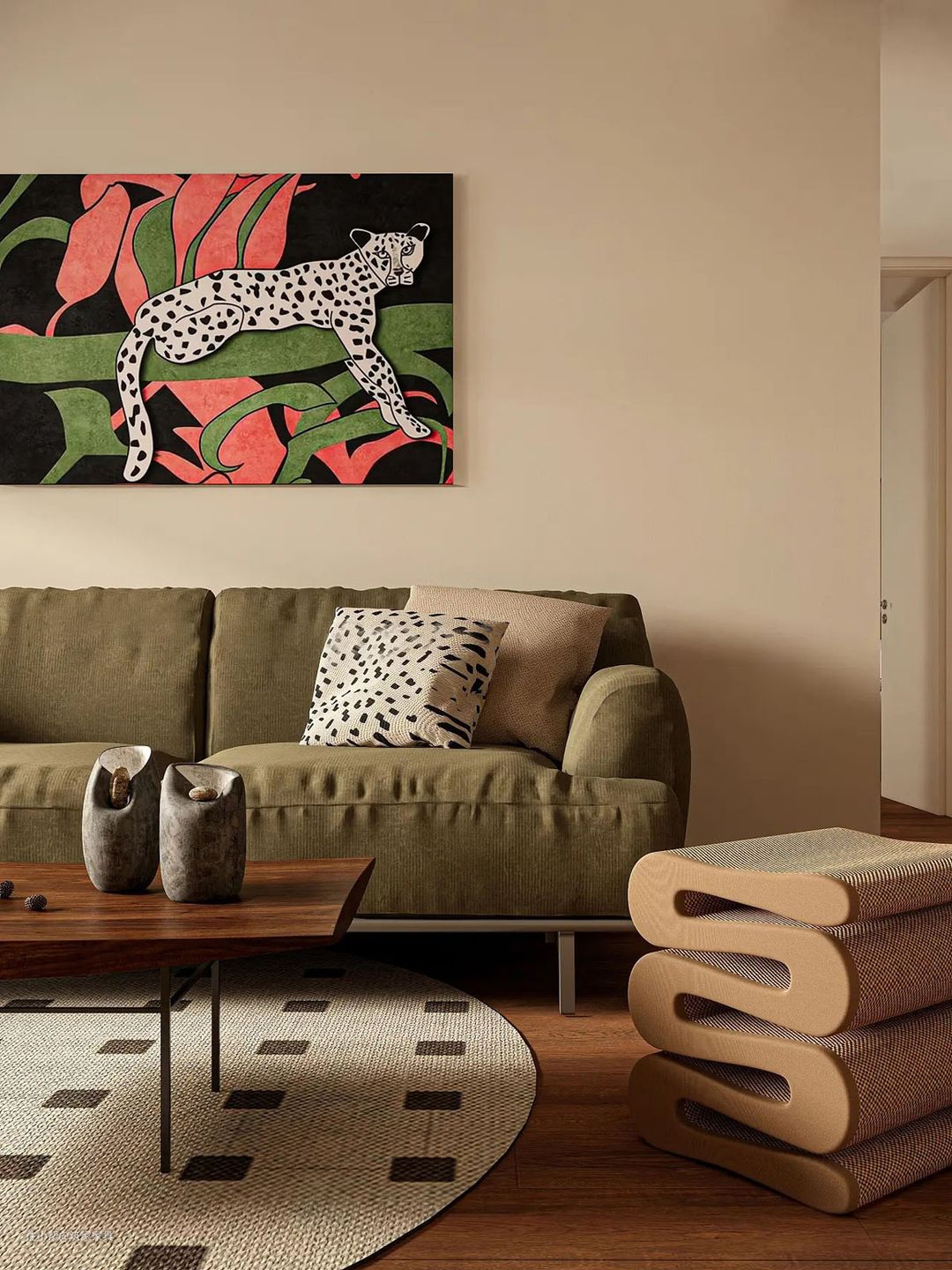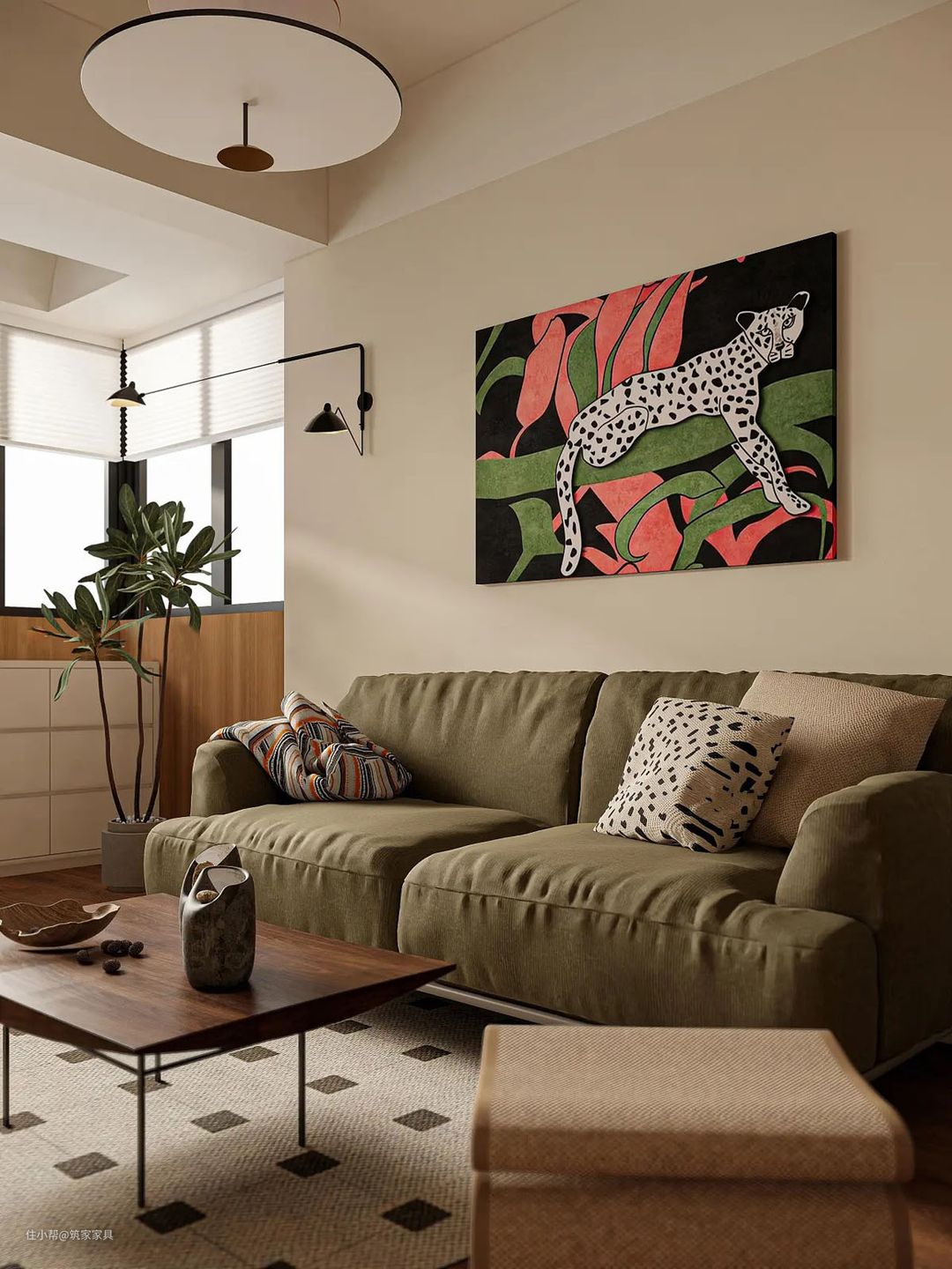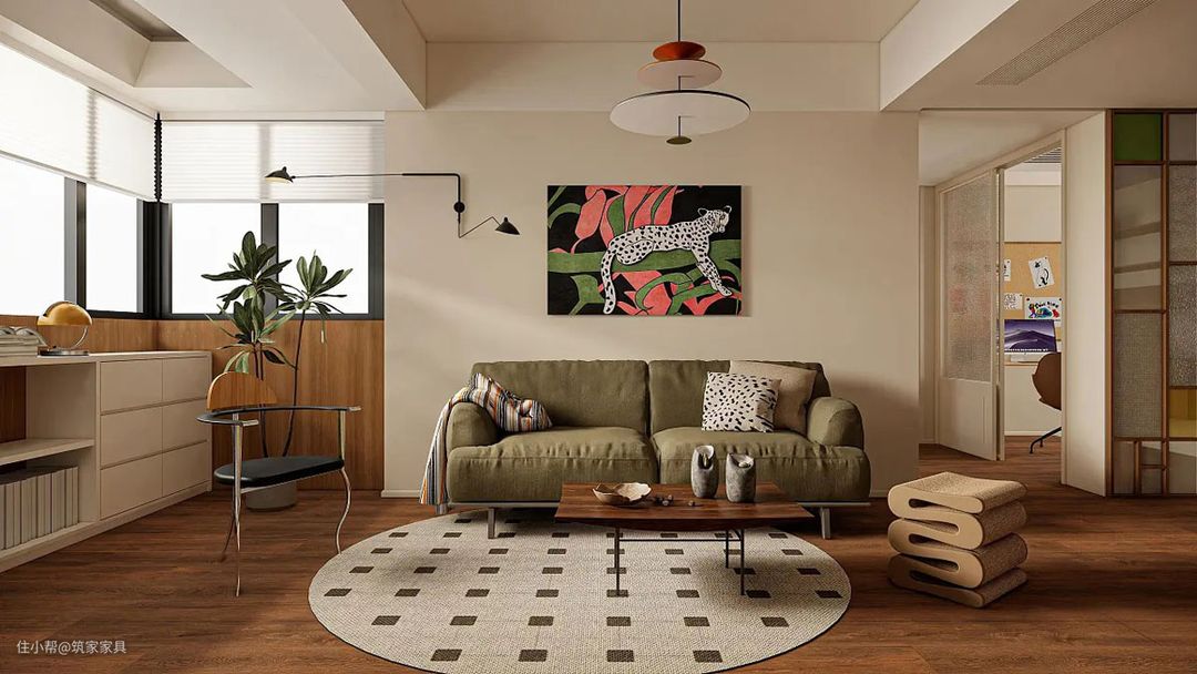 圆形地毯在第二个休息区下方应用了图案。橄榄绿的沙发巧妙地增添了色彩,留下一件明亮的艺术品来吸引所有的注意力。