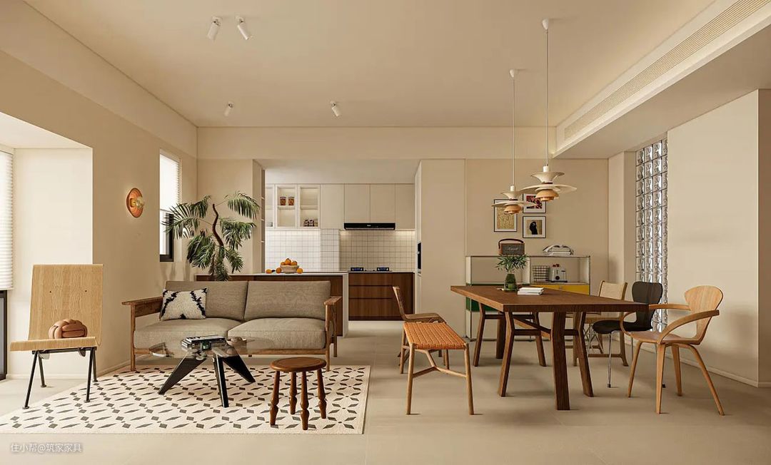 开放式布局的客厅的墙壁和地板上都有平静的浅米色背景。黑白地毯以大胆的图案定义了休息区,而家具则采用了棕色和黑色的色调。