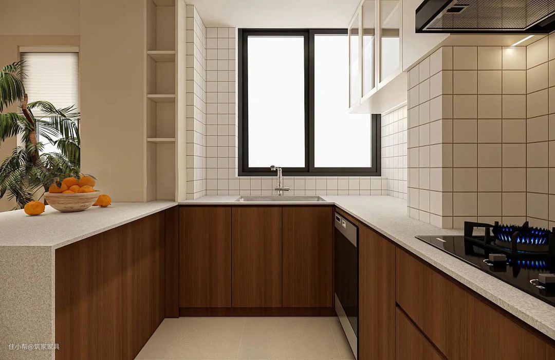 U型厨房采用双色平面橱柜安装。深色木纹底柜使整个构图显得重量重,而白色壁柜则使顶部的东西保持轻盈明亮。