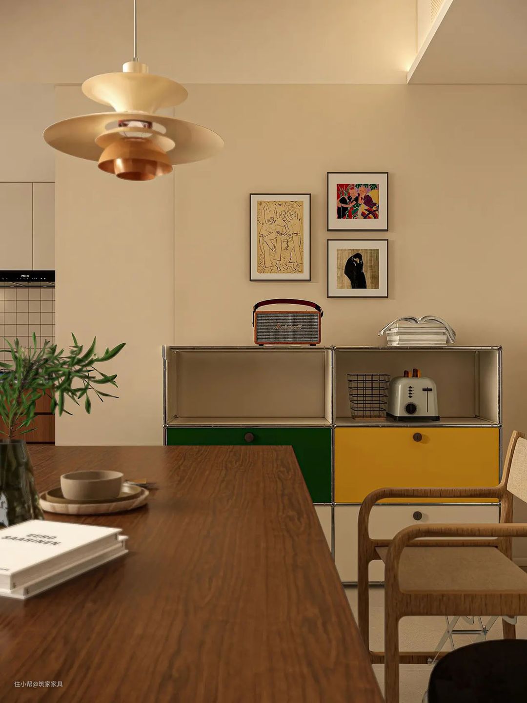 餐厅储物空间以大胆的绿色和金黄色流行色彩为特色。一台复古风格的收音机位于顶部,位于色彩缤纷的画廊墙下方。