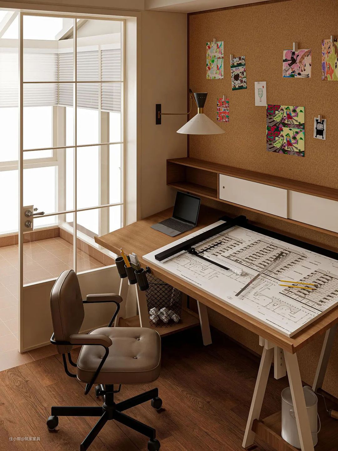 软木记事板上的内容使家庭工作空间变得明亮。建筑师制图桌上方的架子设有用于存放绘图用品的存储空间。