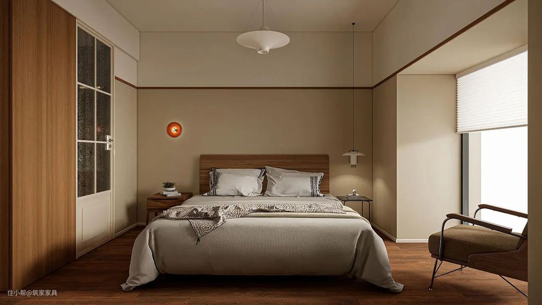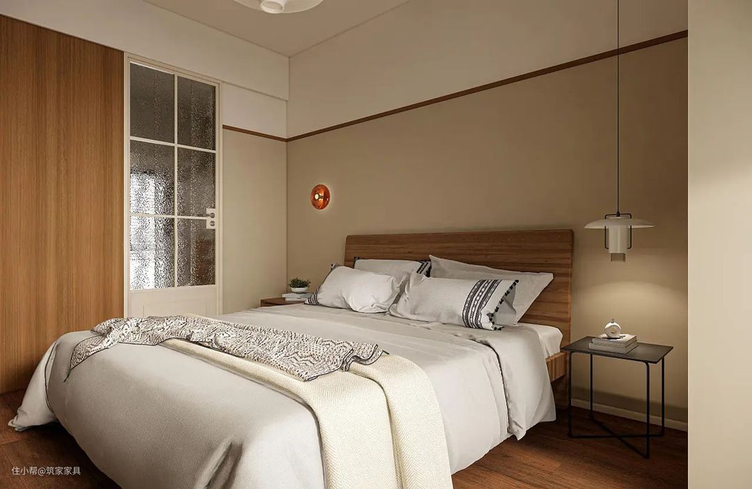 米色卧室是一个宁静的避难所,配有最少的家具和装饰配件。