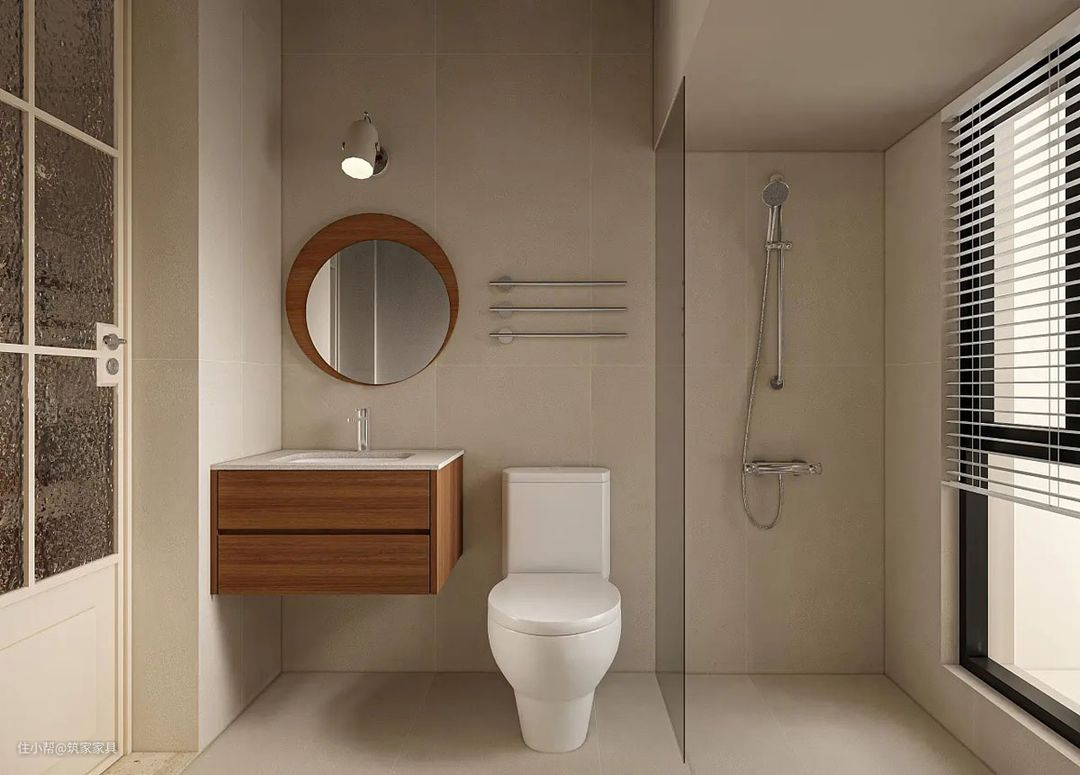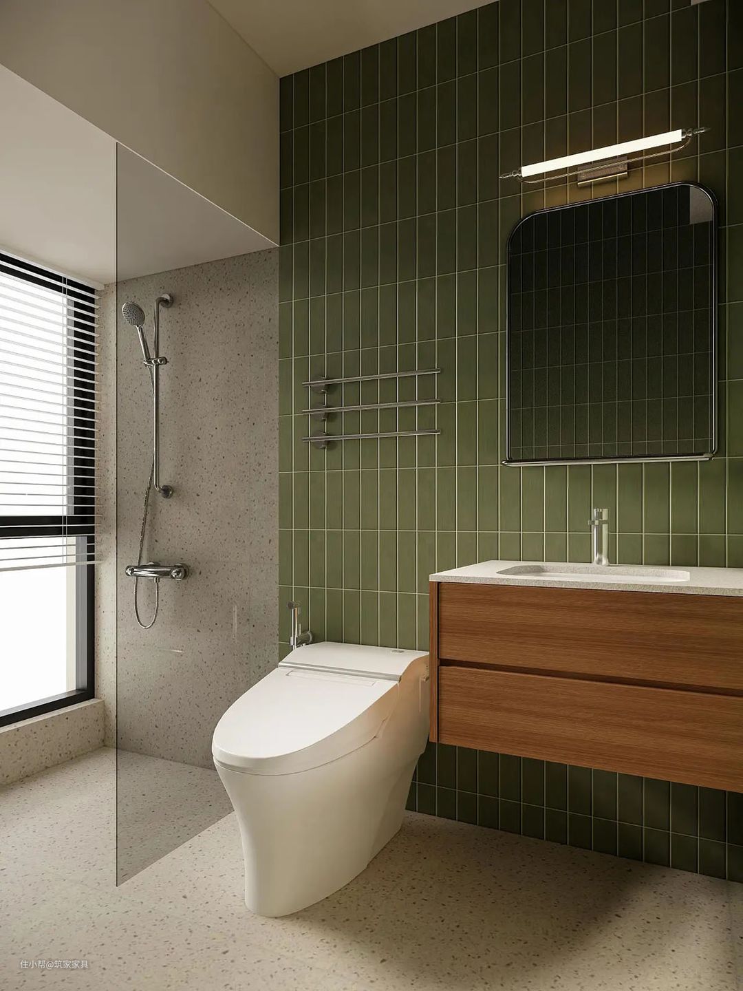 绿色浴室采用开放式淋浴空间设计,墙砖被替换为光滑的湿墙。