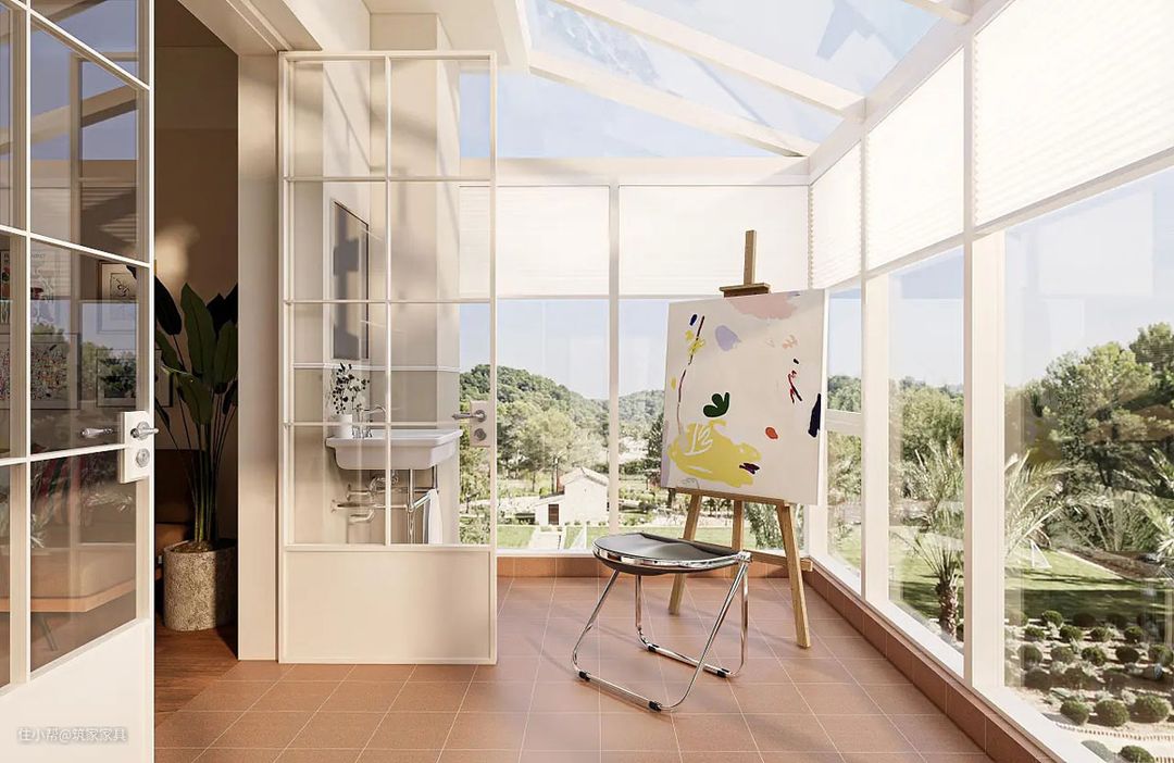 另一组玻璃门将建筑师的工作室与充满阳光的轻松艺术室连接起来。一个画架矗立在瓷砖地板的中央,周围是边对边的窗户。玻璃屋顶可以看到天空的景色。