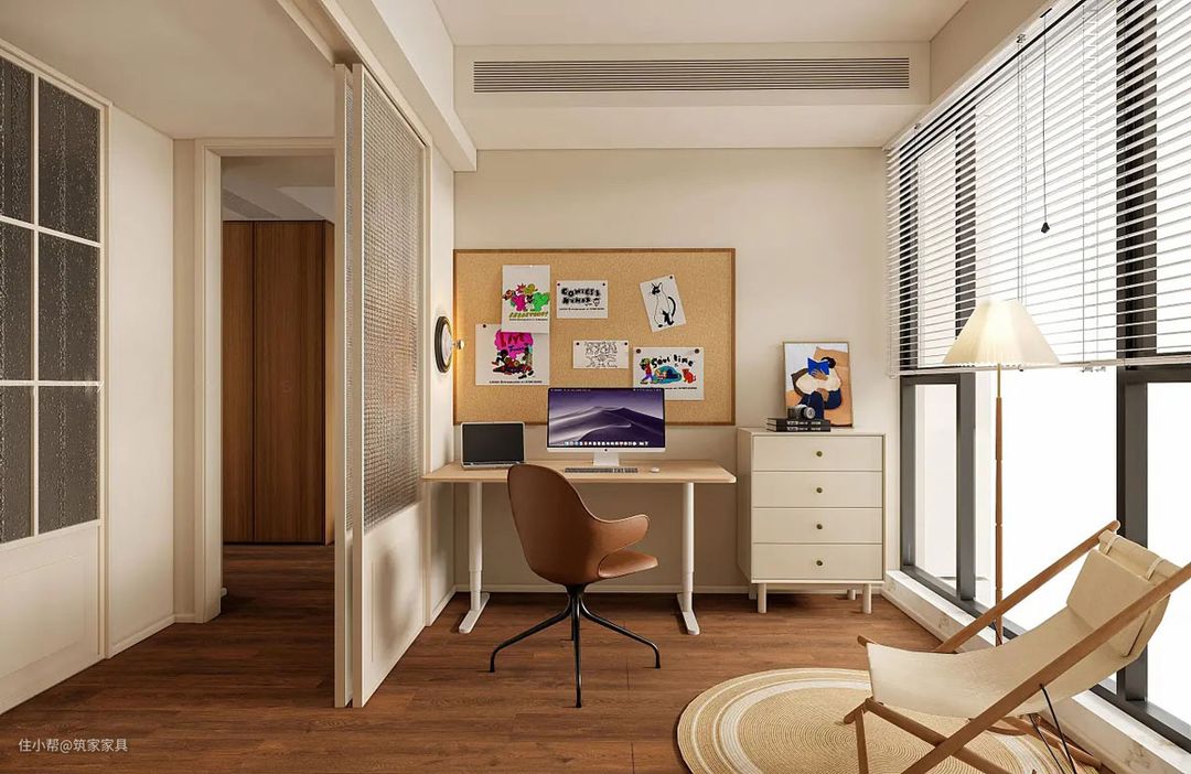 该物业还有第二个家庭工作区,这次有一张电脑桌和一个简单的抽屉柜。窗边布置了一个小小的阅读区。