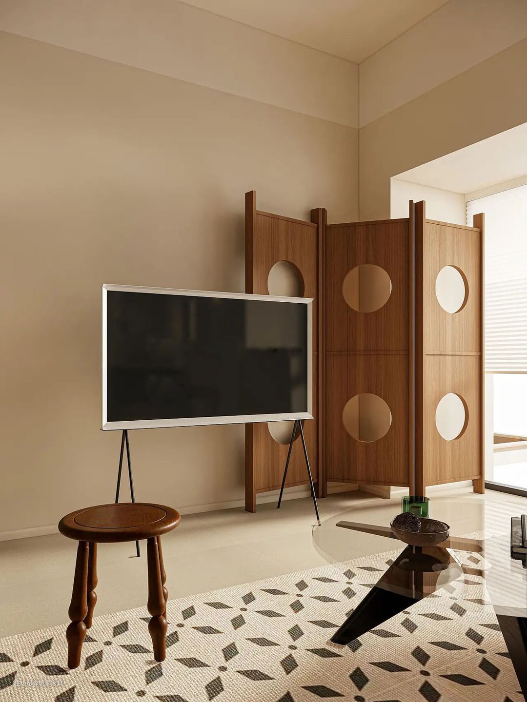 一张传统的带有旋转腿的木凳坐在一张更现代的玻璃咖啡桌旁边。先进的三星 Serif 电视周围有一个装饰性木质屏幕,营造出层次感十足的质感外观。