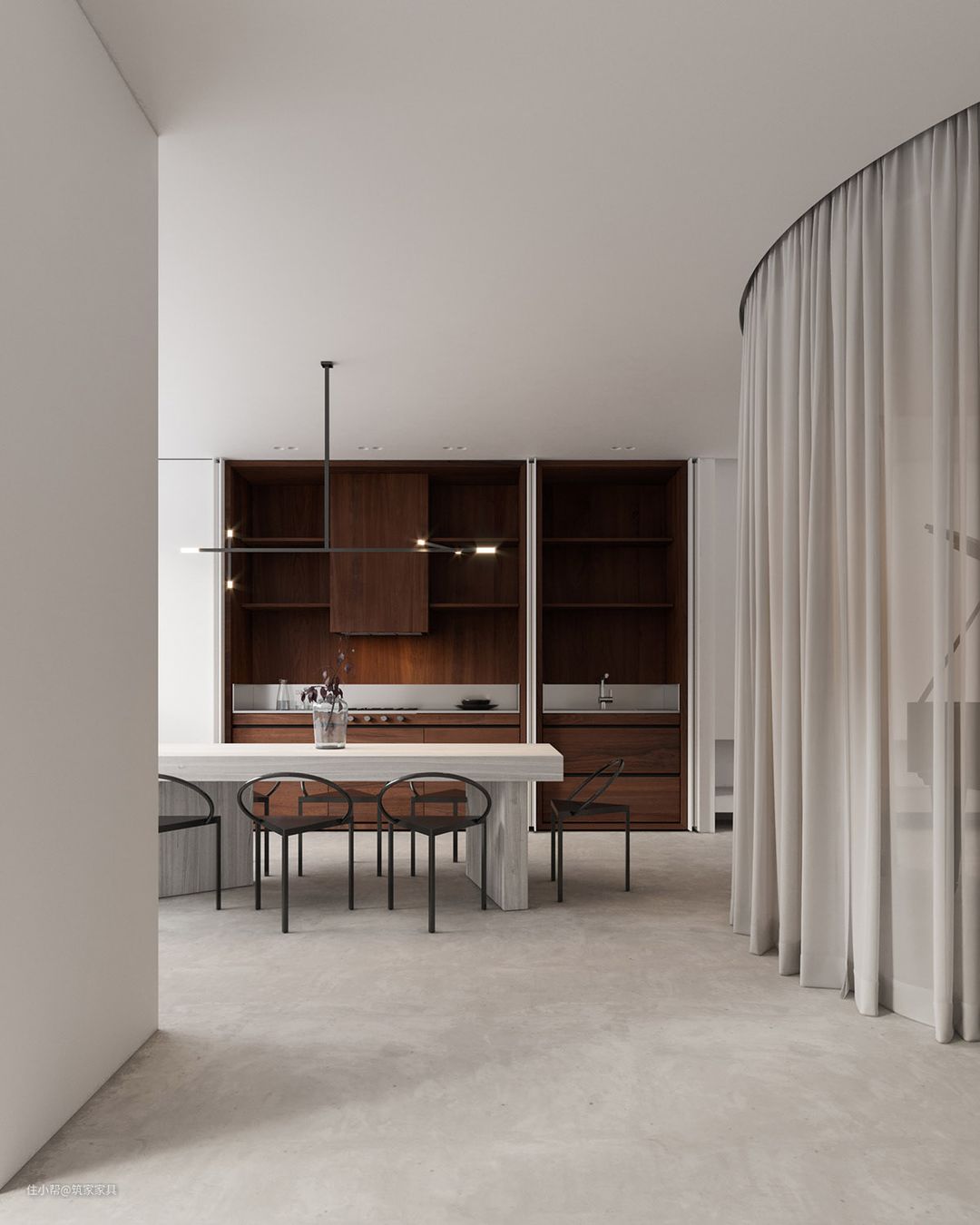 打开平开门、无把手的门,露出一个由对比鲜明的丰富木材制成的厨房。隐藏门允许厨房完全从空间配置中移除,呈现出一个完整而简单的餐厅。这样,厨房的杂乱就不会分散人们对令人垂涎的家庭晚餐的重要性的注意力。