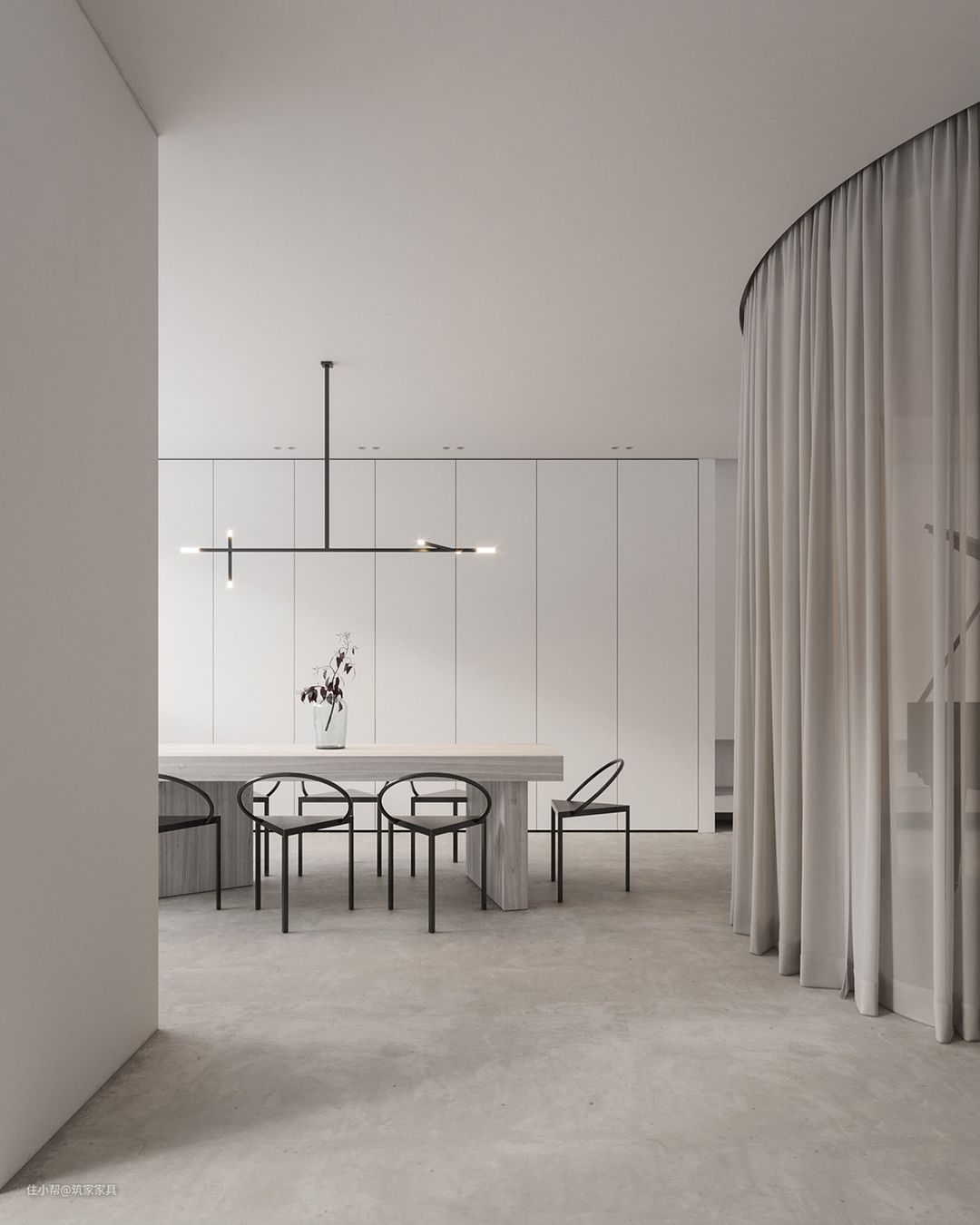 从地板到天花板的窗帘完全包围了这位富有创意的房主的雅马哈钢琴,这是他家新的极简主义住宅中唯一不可妥协的钢琴。该乐器构成了客厅的中心,但当完全关闭时,可以在这件斗篷后面以一种孤独的方式演奏。钢琴也可以暴露在餐厅里,以便进行一些即兴的晚餐娱乐活动。