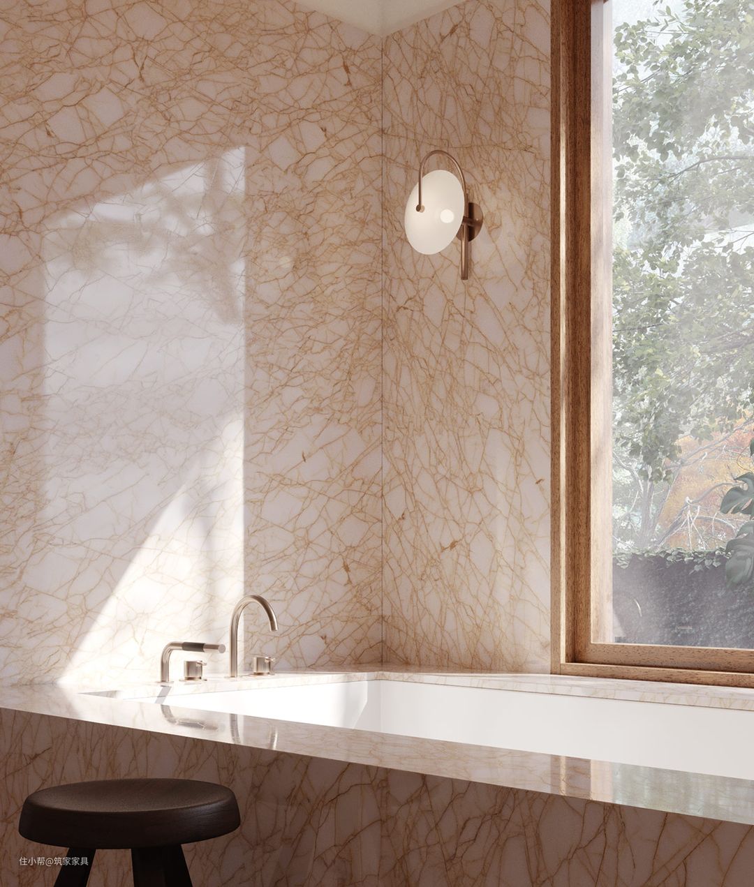 现代水龙头充满了深边的石质浴缸。壁灯共享环境光。