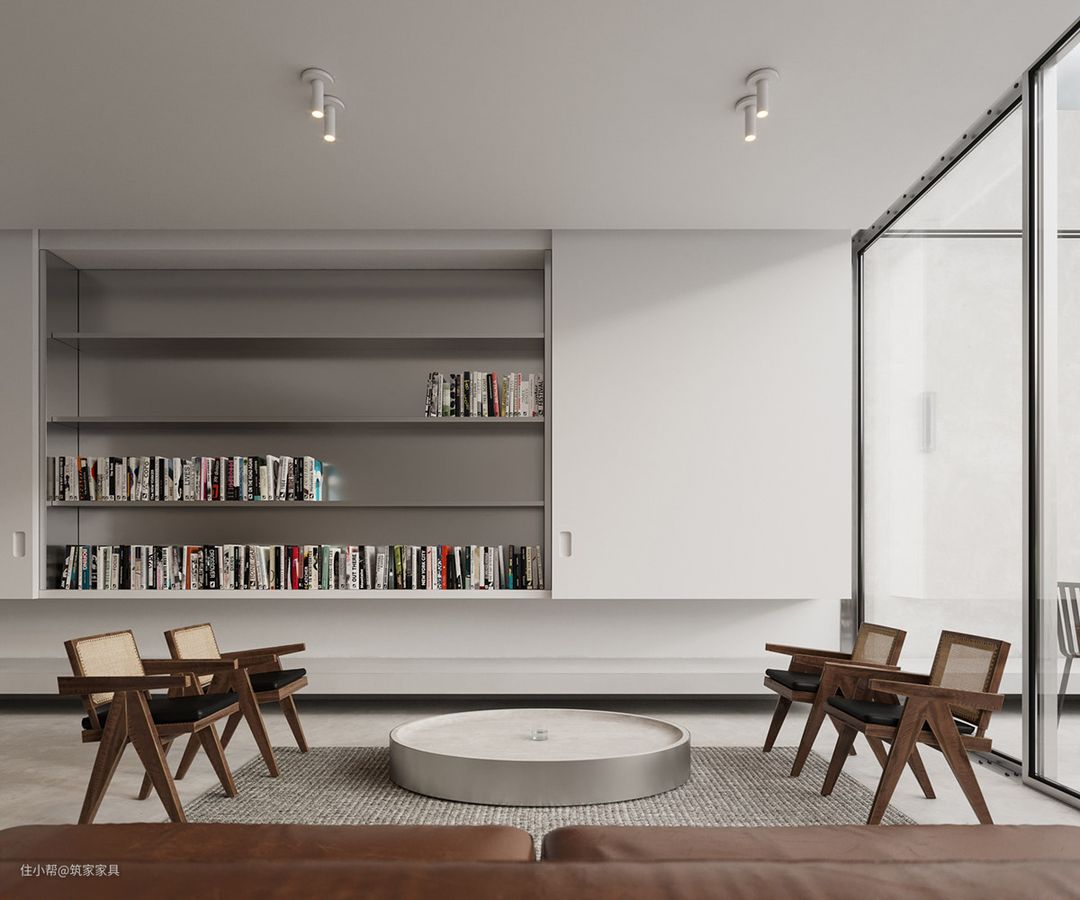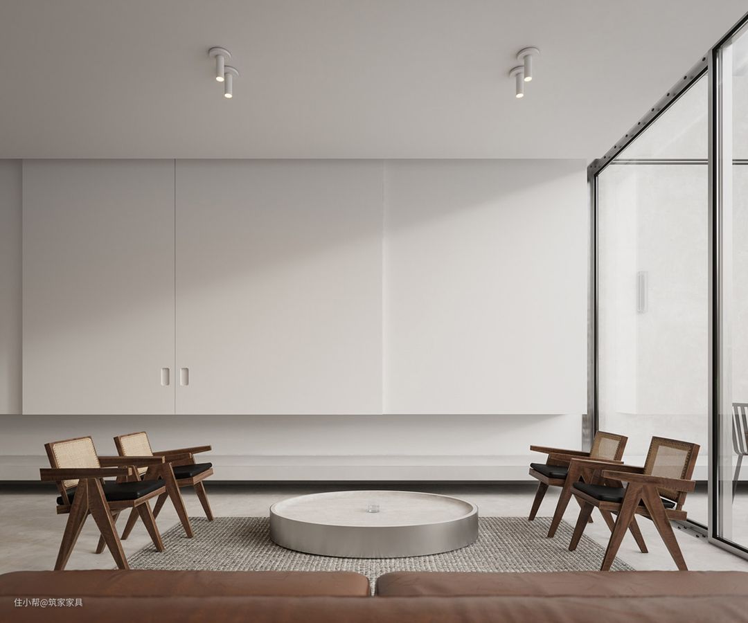 简约的客厅是一套椅子、沙发和地板拥抱圆形咖啡桌。